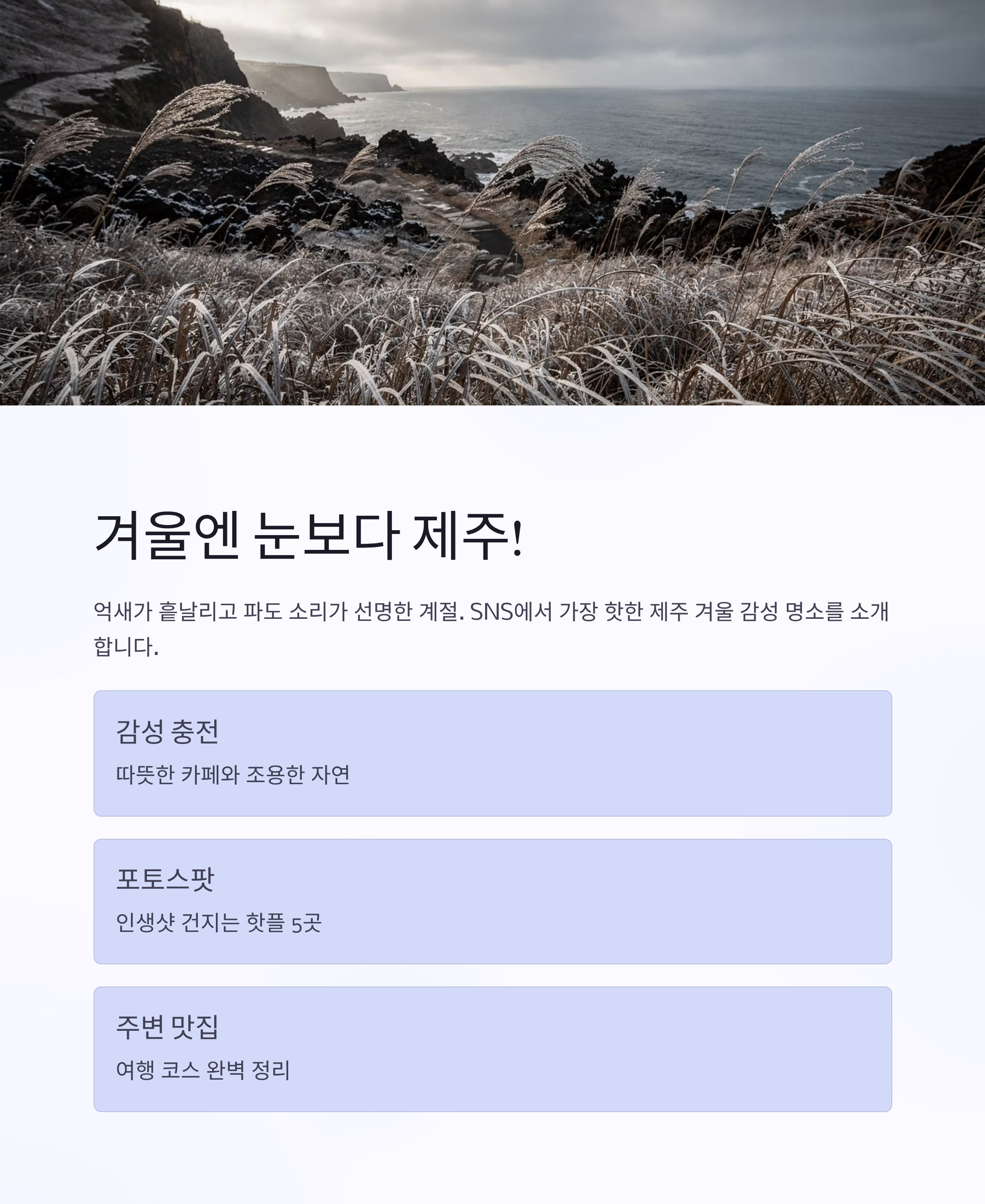 겨울이면 유난히 더 감성적인 제주. 눈 대신 억새가 흩날리고, 파도 소리가 더 선명하게 들리는 계절이죠. 따뜻한 카페와 조용한 자연 속에서 힐링을 찾는 이들에게 SNS에서는 벌써부터 ‘제주 겨울 여행’이 핫한 키워드로 떠오르고 있어요. 오늘은 SNS에서 인기 많은 제주 겨울 핫플 5곳을 소개해드립니다. 장소별 특징, 포토스팟, 주변 맛집까지 꾹꾹 눌러 담았어요. 감성 충전하고 싶은 분이라면 바로 체크해보세요!