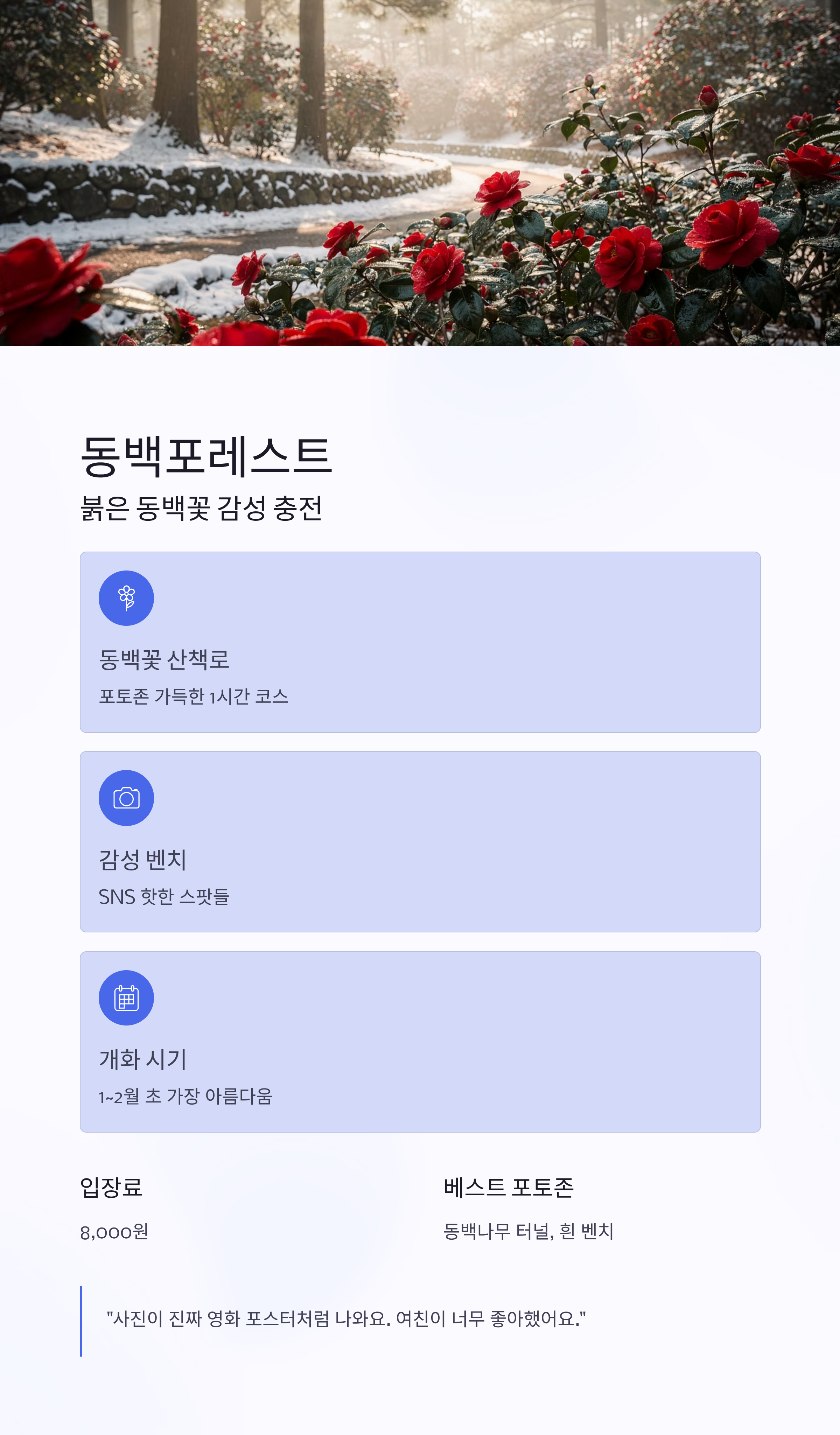“동백은 그냥 꽃이 아니에요. 사진이 진짜 영화 포스터처럼 나와요. 여친이 너무 좋아해서 한참 머물렀어요.”주변 맛집 & 카페