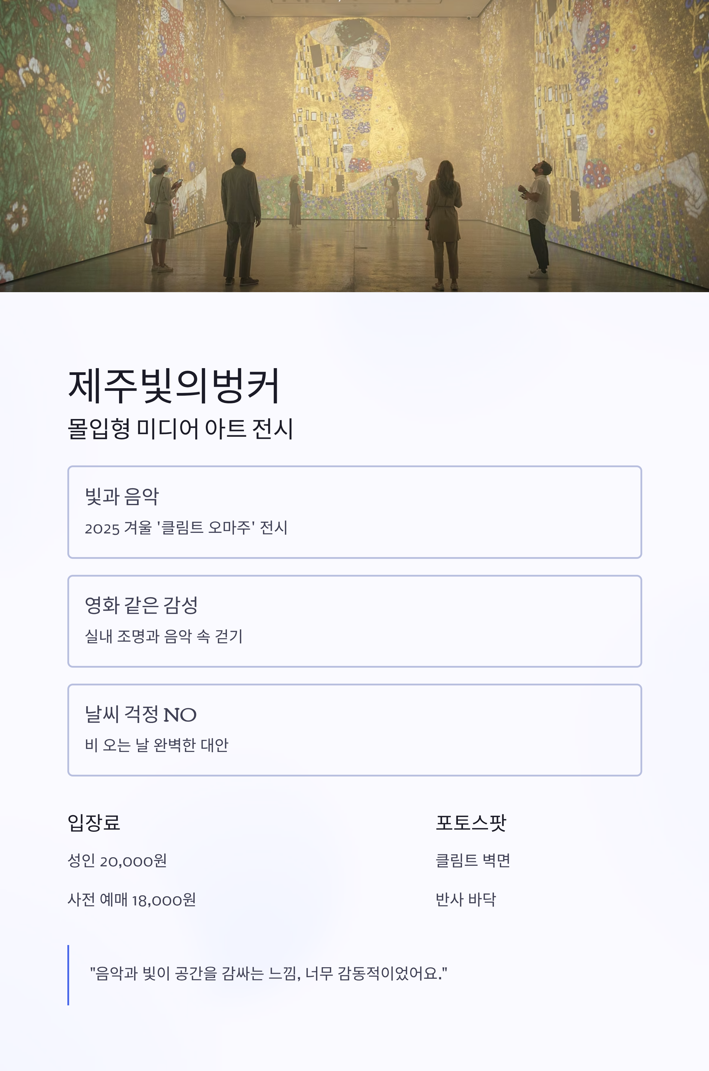 - 빛과 음악이 어우러진 전시: 2025 겨울 전시는 ‘클림트 오마주’ 예정
