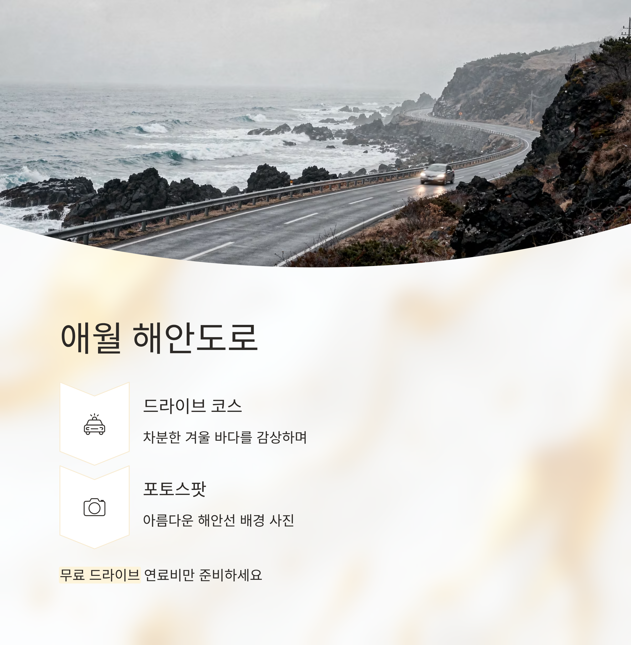 애월 해안도로는 제주의 대표적인 드라이브 코스로, 겨울철에는 더욱 차분하고 한적한 분위기 속에서 바다를 감상하며 드라이브를 즐길 수 있습니다. 제주의 아름다운 해안선과 푸른 바다가 어우러져 멋진 풍경을 제공합니다.즐길거리: