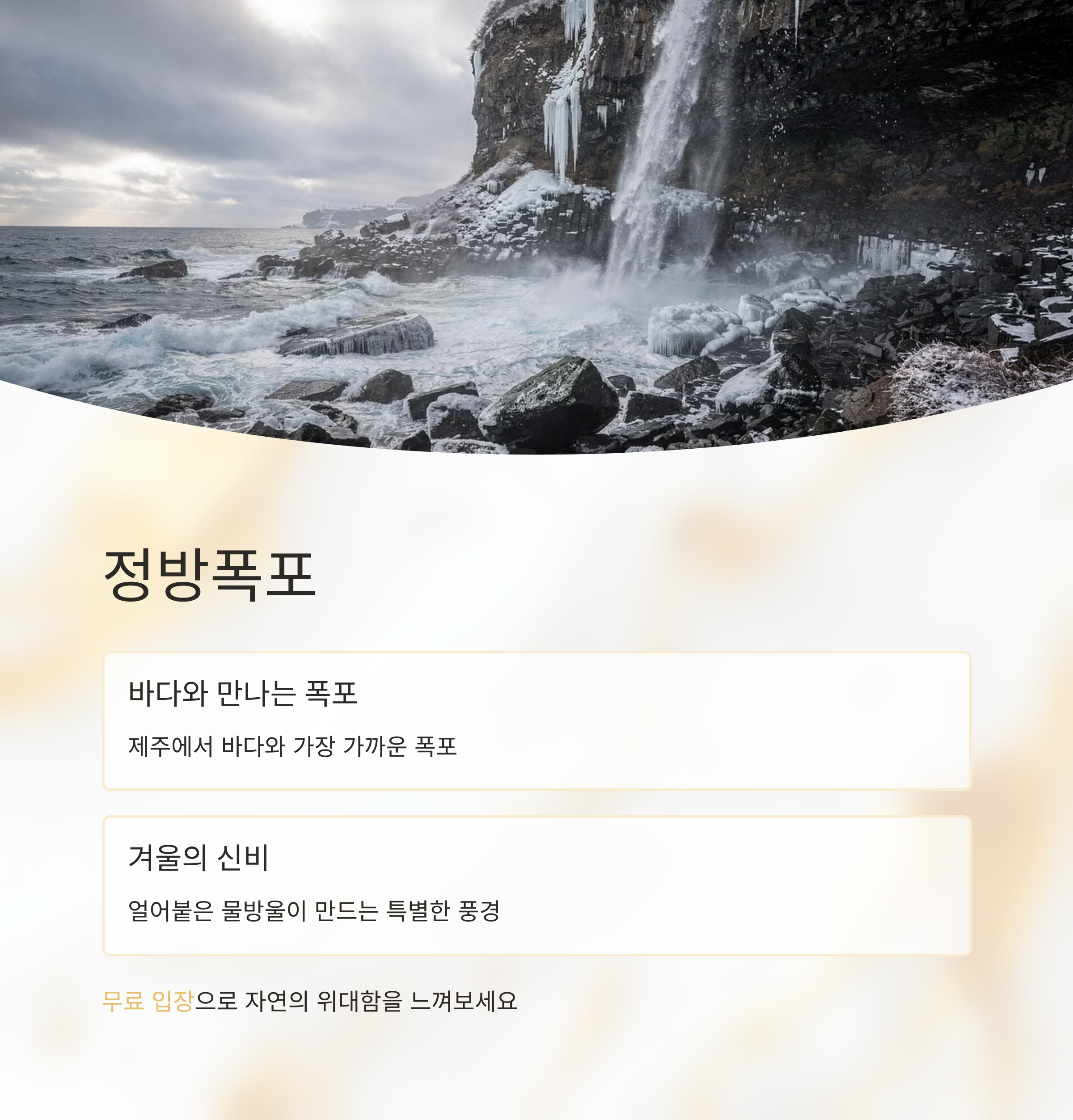 "정방폭포는 정말 인상 깊었습니다. 바다와 폭포가 어우러진 모습이 너무 아름다워서 사진을 많이 찍었어요. 겨울에 방문했는데, 얼어붙은 물방울이 신비롭게 보였어요."