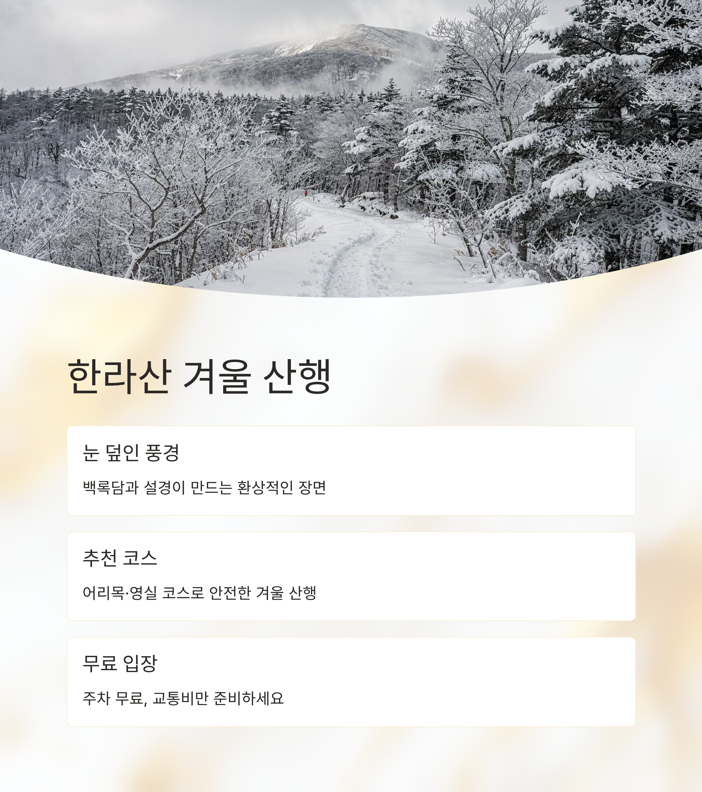 "겨울 한라산은 정말 아름다웠습니다. 눈 덮인 숲길을 걷는 기분은 정말 환상적이었고, 정상에서 보는 제주 전경은 그야말로 장관이었습니다. 하얀 설경을 보며 걷는 경험은 평생 기억에 남을 것 같습니다."