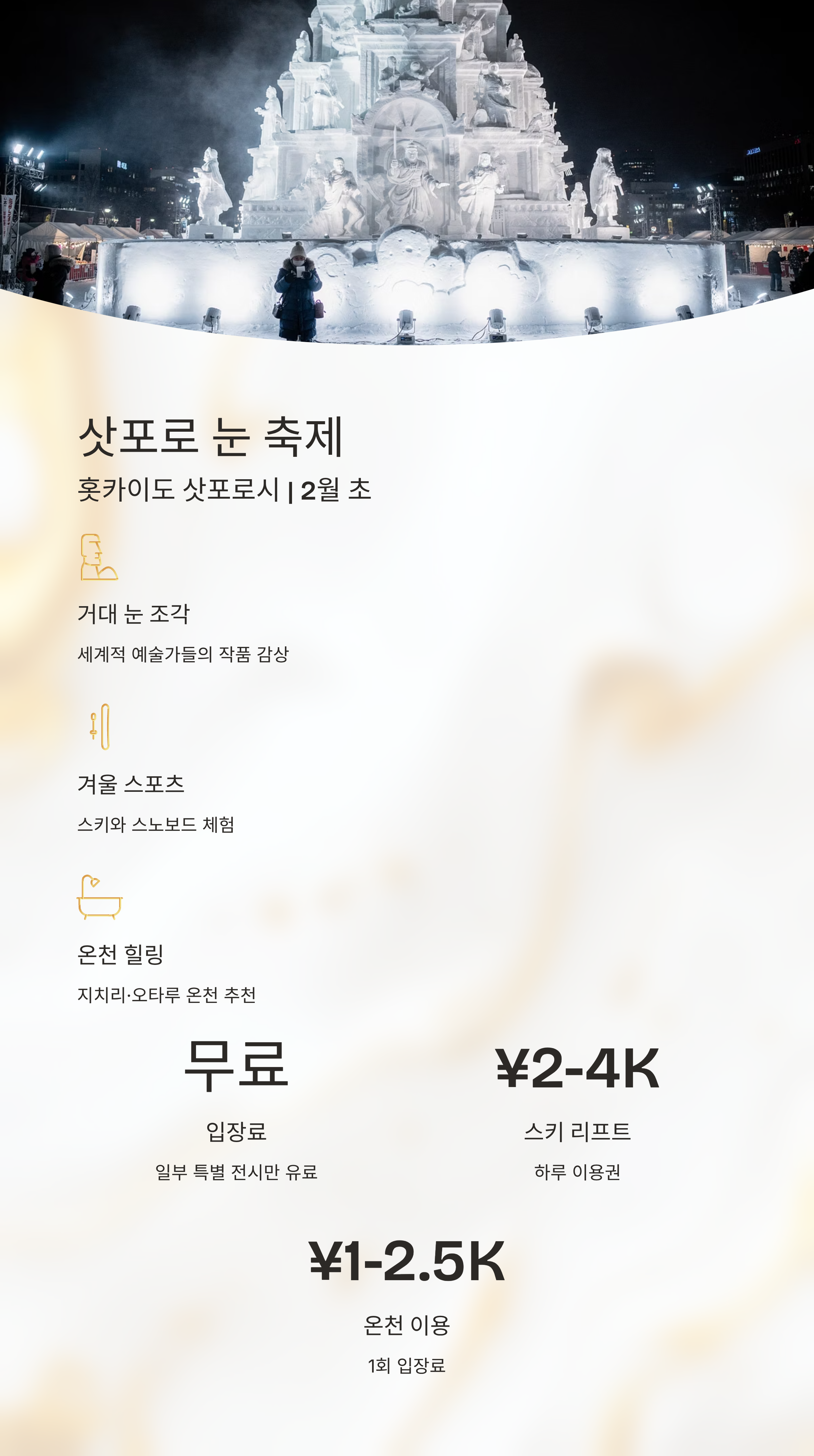 "삿포로 눈 축제는 정말 환상적이었습니다! 눈 조각들은 너무 아름다워서 사진을 찍지 않을 수 없었어요. 밤에는 조명이 켜져 더욱 멋있었고, 따뜻한 온천도 함께 즐길 수 있어서 완벽한 겨울 여행이었어요."이동수단 및 예상비용: