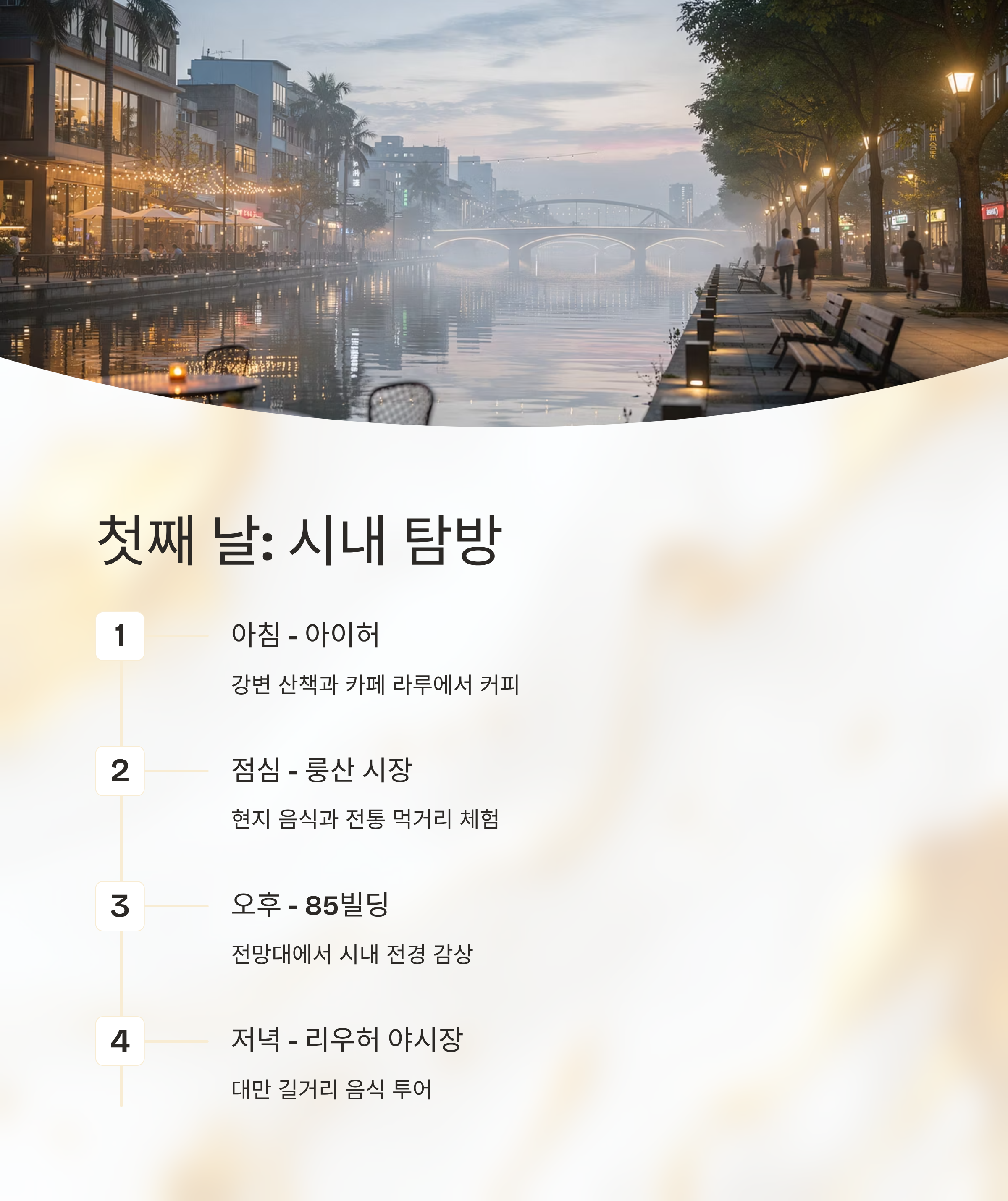 - 첫날: 아이허에서의 아침 산책, 85빌딩 전망대, 리우허 야시장 방문