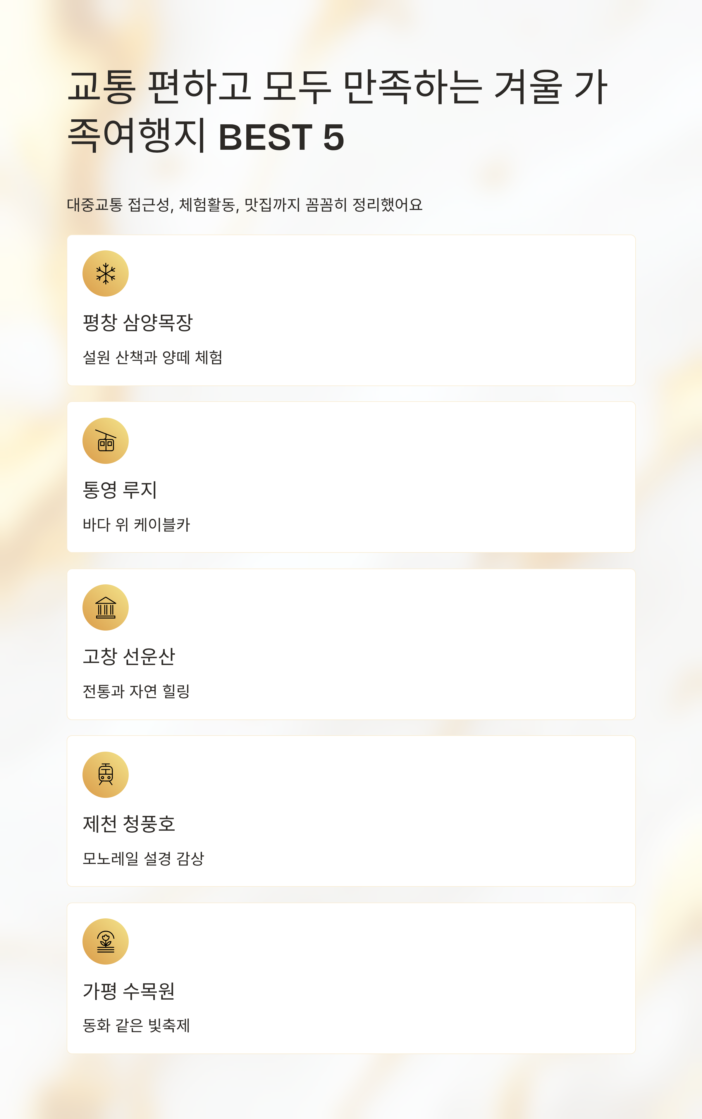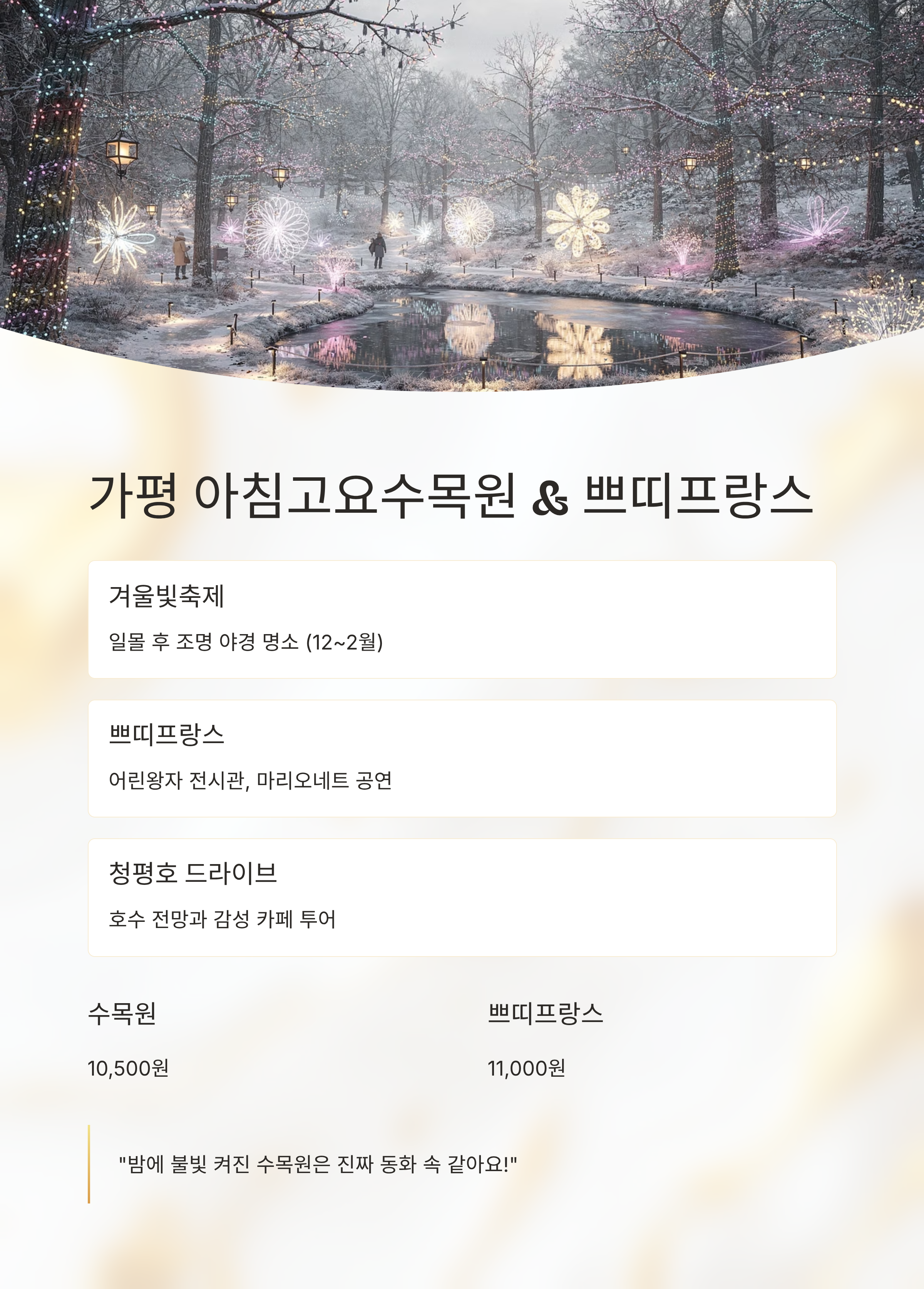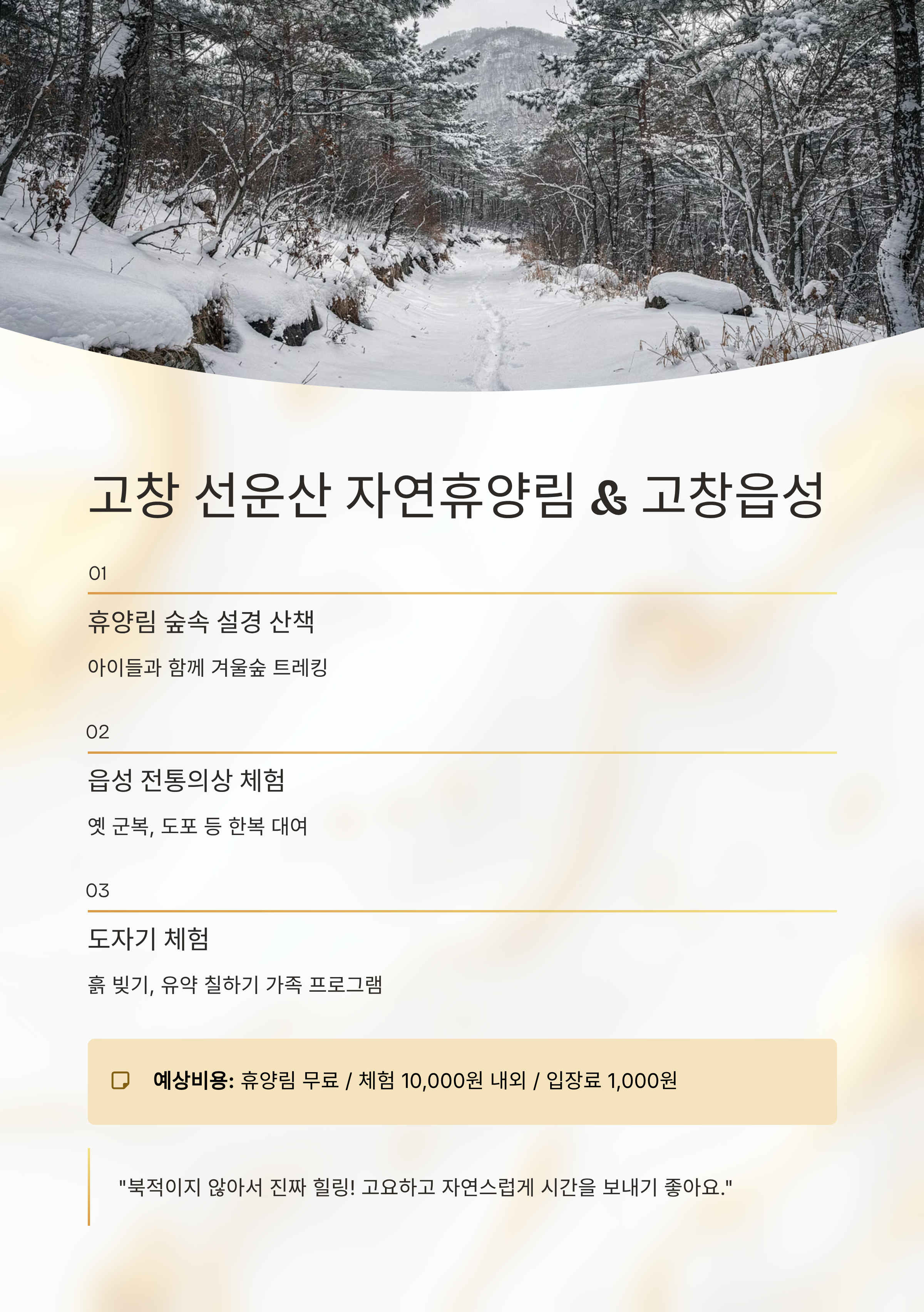 평창 삼양목장 설경 산책 + 눈썰매 + 동물체험 약 15,000원 통영 루지 + 케이블카 + 미륵산 트레킹 약 33,000원 고창 휴양림 설경 산책 + 읍성 탐방 + 도예체험 약 12,000원 제천 모노레일 + 족욕 + 의림지 산책 약 15,000원 가평 아침고요수목원 + 쁘띠프랑스 + 카페투어 약 22,000원 총 여행 예산 (1인 기준, 식비·숙박 제외)