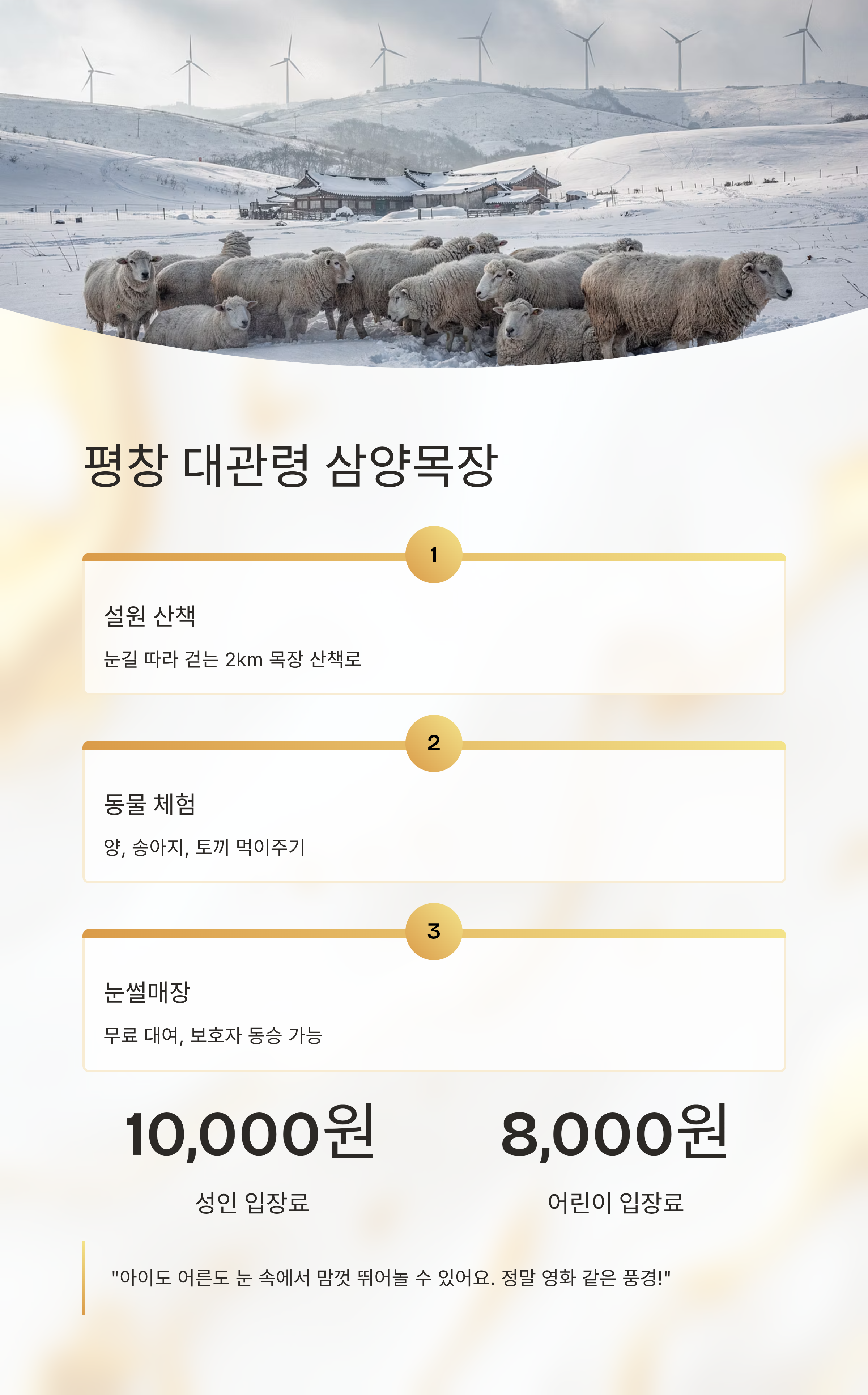 겨울철 눈밭이 절경인 대관령. 드넓은 삼양목장에서는 양떼 체험과 설산 풍경을 동시에 즐길 수 있어요.즐길거리
