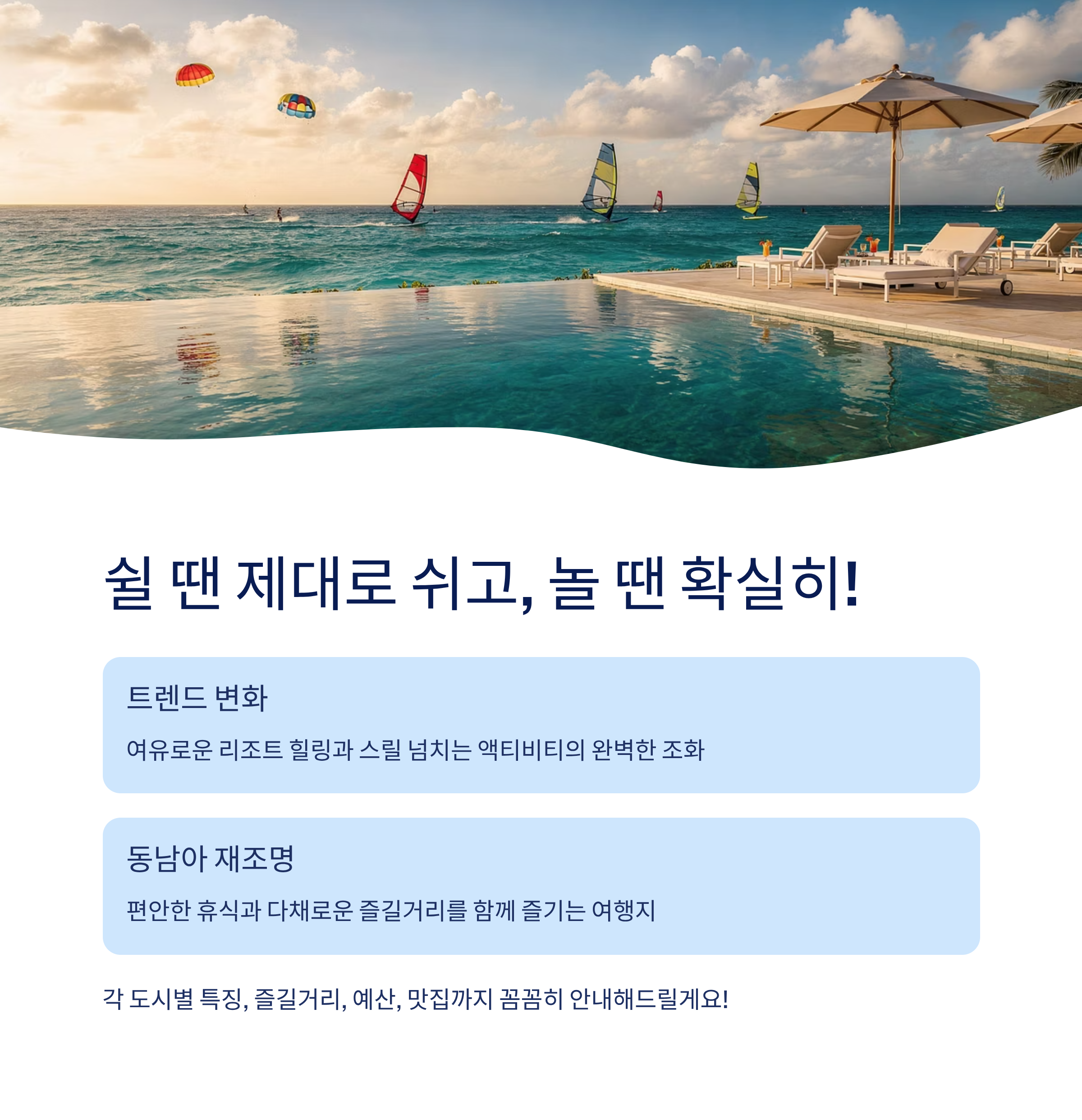 여행에서 ‘쉼’만 원하던 시대는 지났습니다. 이제는 여유로운 리조트에서 힐링하다가, 어느 순간엔 스릴 넘치는 액티비티로 하루를 꽉 채우는 것이 트렌드죠. 최근 동남아는 그 완벽한 조화를 보여주는 여행지로 재조명받고 있어요. 편안한 휴식과 다채로운 즐길거리를 함께 즐기고 싶다면? 지금 소개하는 동남아 5대 인기 여행지는 절대 놓치면 안 될 리스트입니다. 각 도시별 특징, 즐길거리, 실속 있는 여행 예산, 맛집까지 꼼꼼히 안내해 드릴게요.