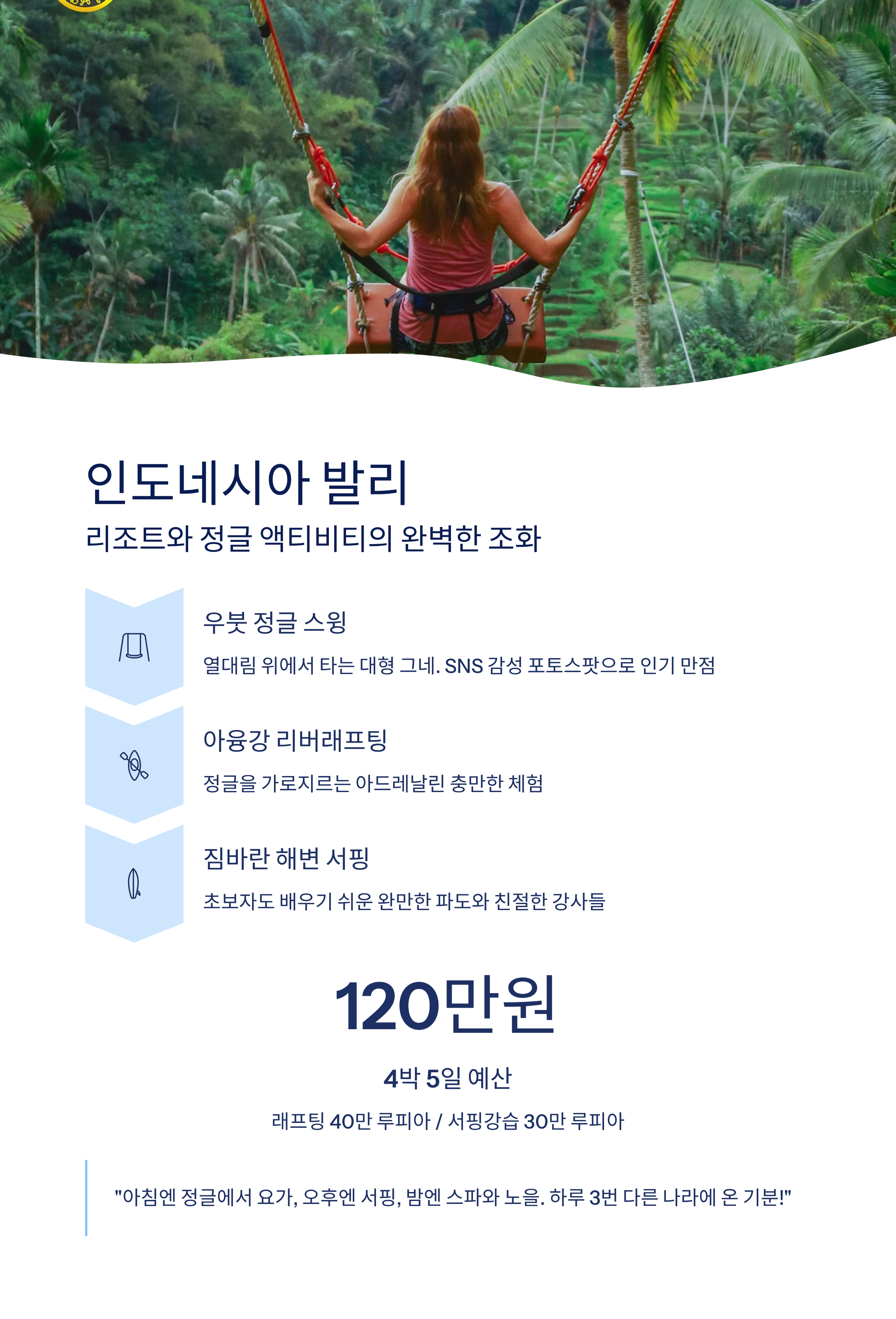 다낭 도심+해변 리조트 골든브릿지, 패러세일링 약 90만 원 도시+자연 끄라비 자연+해양 액티비티 호핑투어, 암벽등반 약 100만 원 한적한 정글+바다 발리 정글+힐링 정글스윙, 래프팅, 서핑 약 120만 원 요가+리조트 코타키나발루 바다+산의 조화 스노클링, 선셋 요트 약 110만 원 균형 잡힌 모험 보홀 순수 자연+해양체험 다이빙, ATV, 리버크루즈 약 100만 원 조용한 청정섬