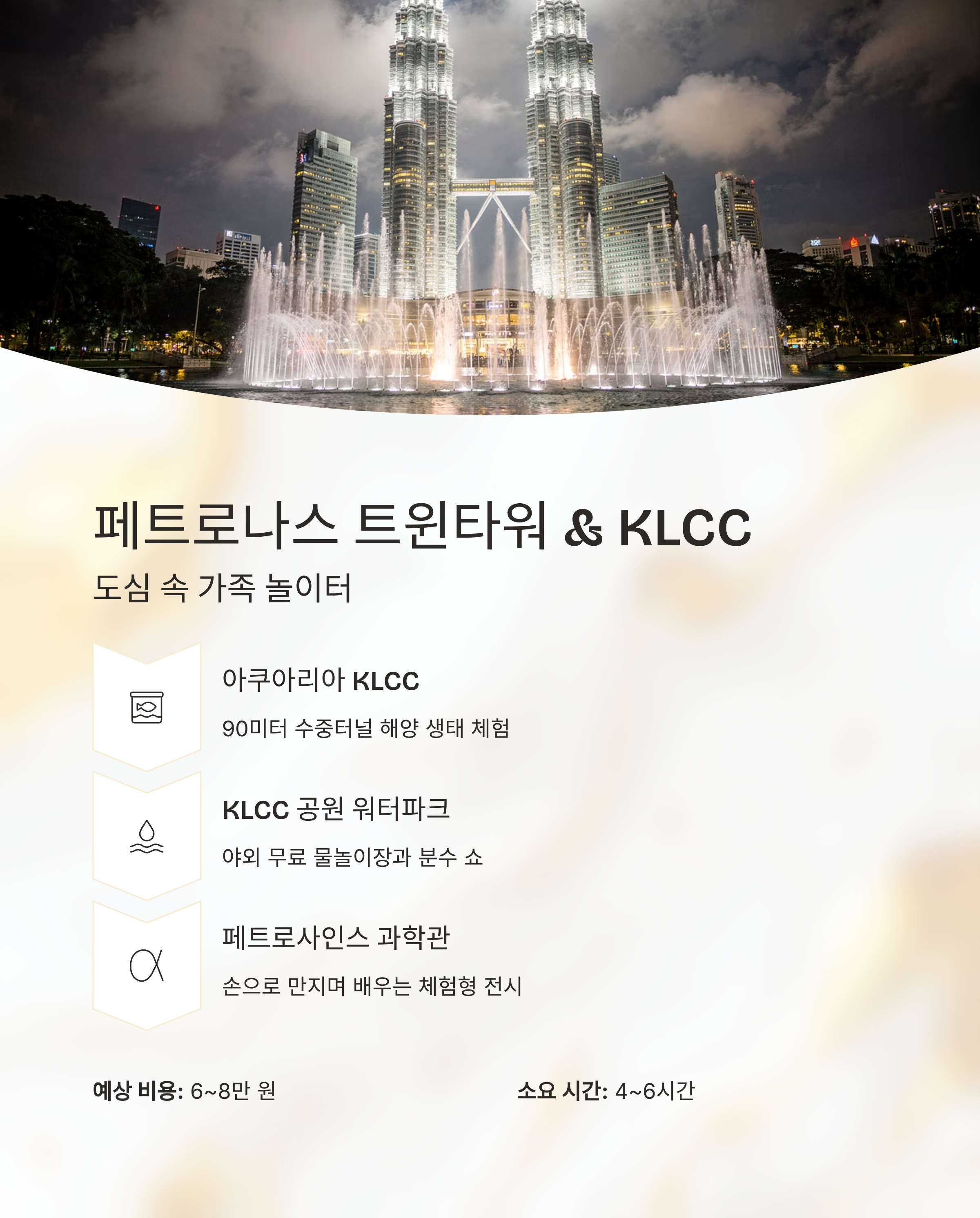 말레이시아를 대표하는 랜드마크 트윈타워와 그 아래 위치한 수리아 KLCC 몰은 단순 쇼핑센터가 아니라 아쿠아리움, 과학관, 물놀이장까지 있는 복합 놀이터예요. 하루 종일 머물러도 모자람이 없습니다.즐길거리 상세