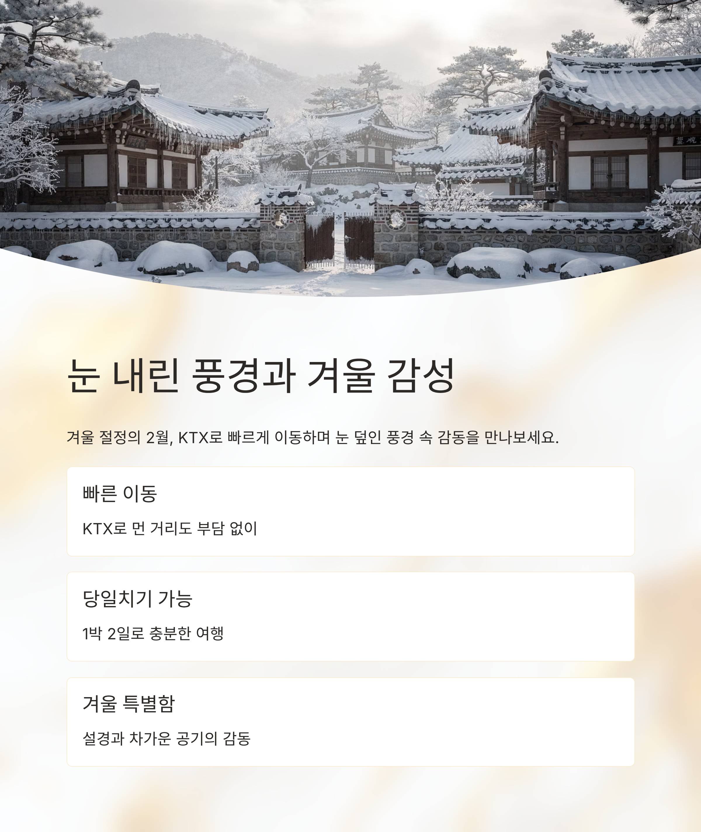 눈 내린 풍경과 겨울 감성이 가득한 KTX 국내 여행지, 어디가 좋을까?