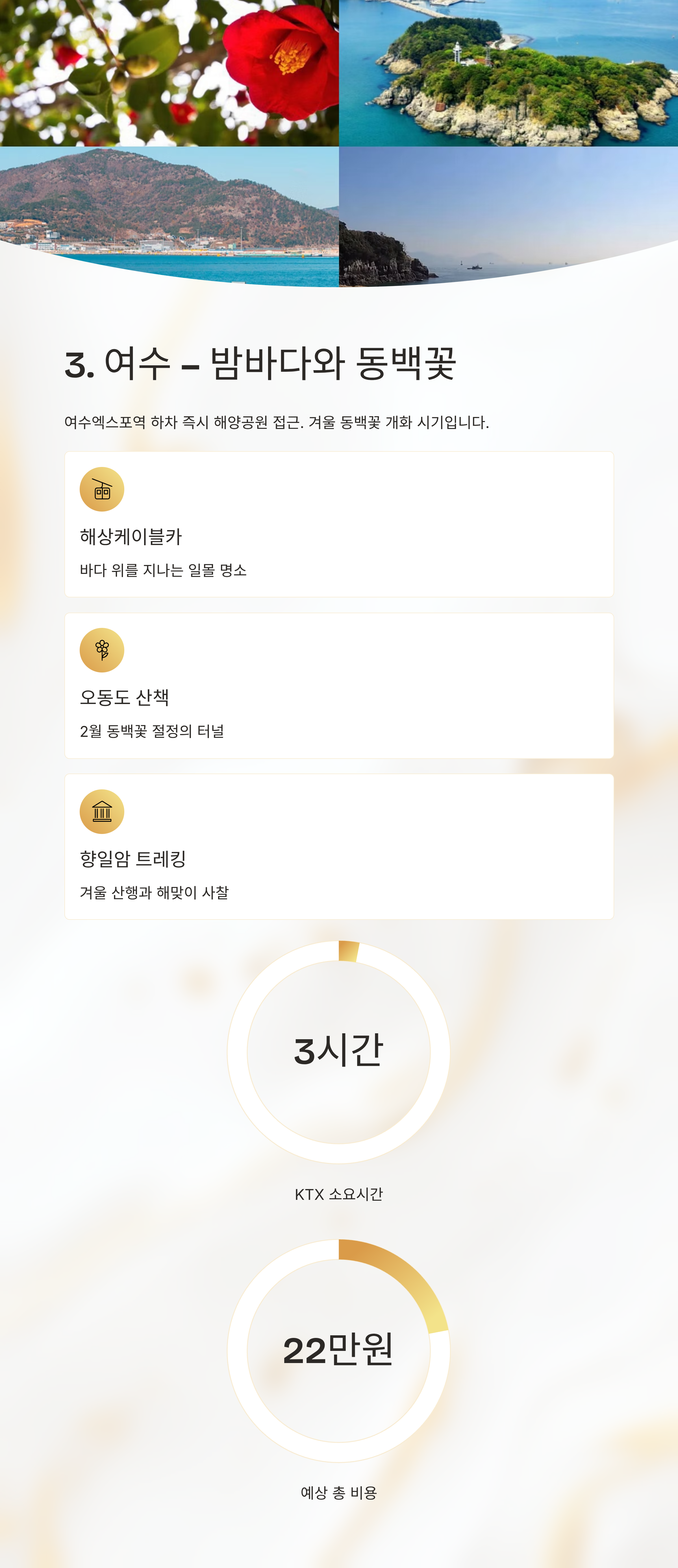 강릉 약 2시간 해돋이, 커피거리 7~10만원 약 20만원 경주 약 2시간 10분 문화유산, 야경 6~9만원 약 18만원 여수 약 3시간 동백꽃, 야경 8~11만원 약 22만원 전주 약 1시간 50분 한옥, 전통체험 7~9만원 약 17만원 부산 약 2시간 40분 바다, 야경, 온천 9~12만원 약 25만원