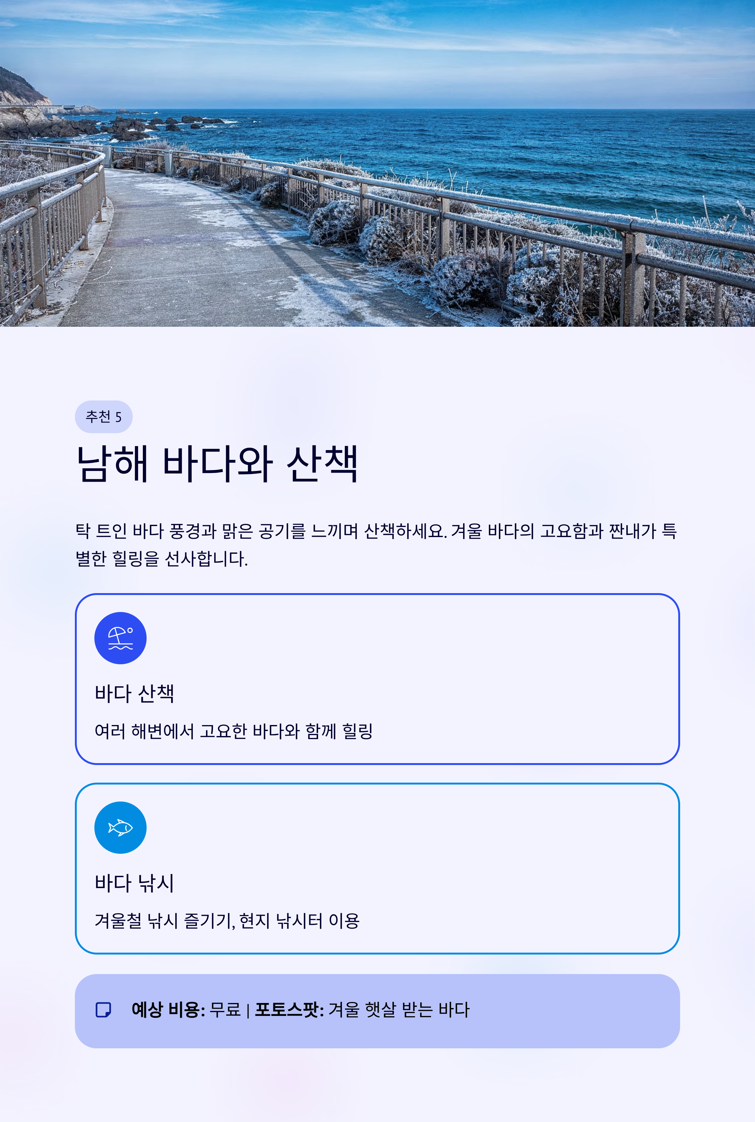 “겨울 바다에서 산책을 즐기면서 정말 힐링이 되었어요. 바람이 차지만, 상쾌한 기분을 느낄 수 있었고 바다의 평온한 풍경이 마음을 차분하게 해주었습니다.”