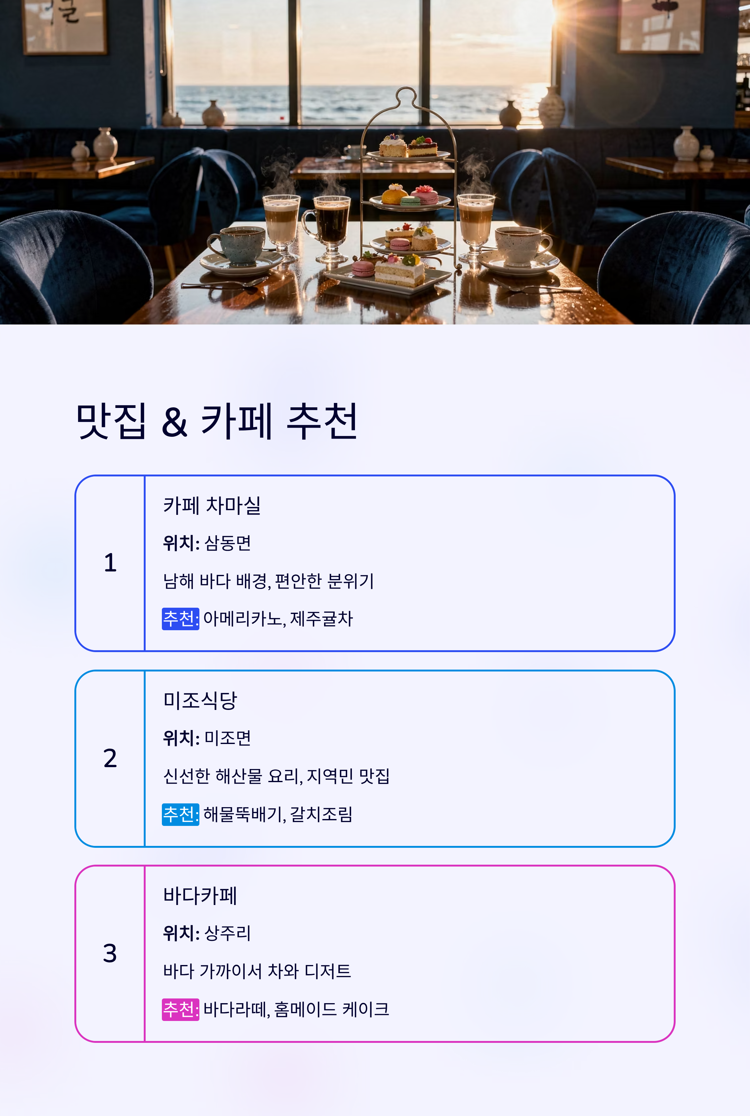 특징: 남해 바다를 배경으로 한 카페로, 편안한 분위기 속에서 커피와 차를 즐길 수 있는 곳입니다.