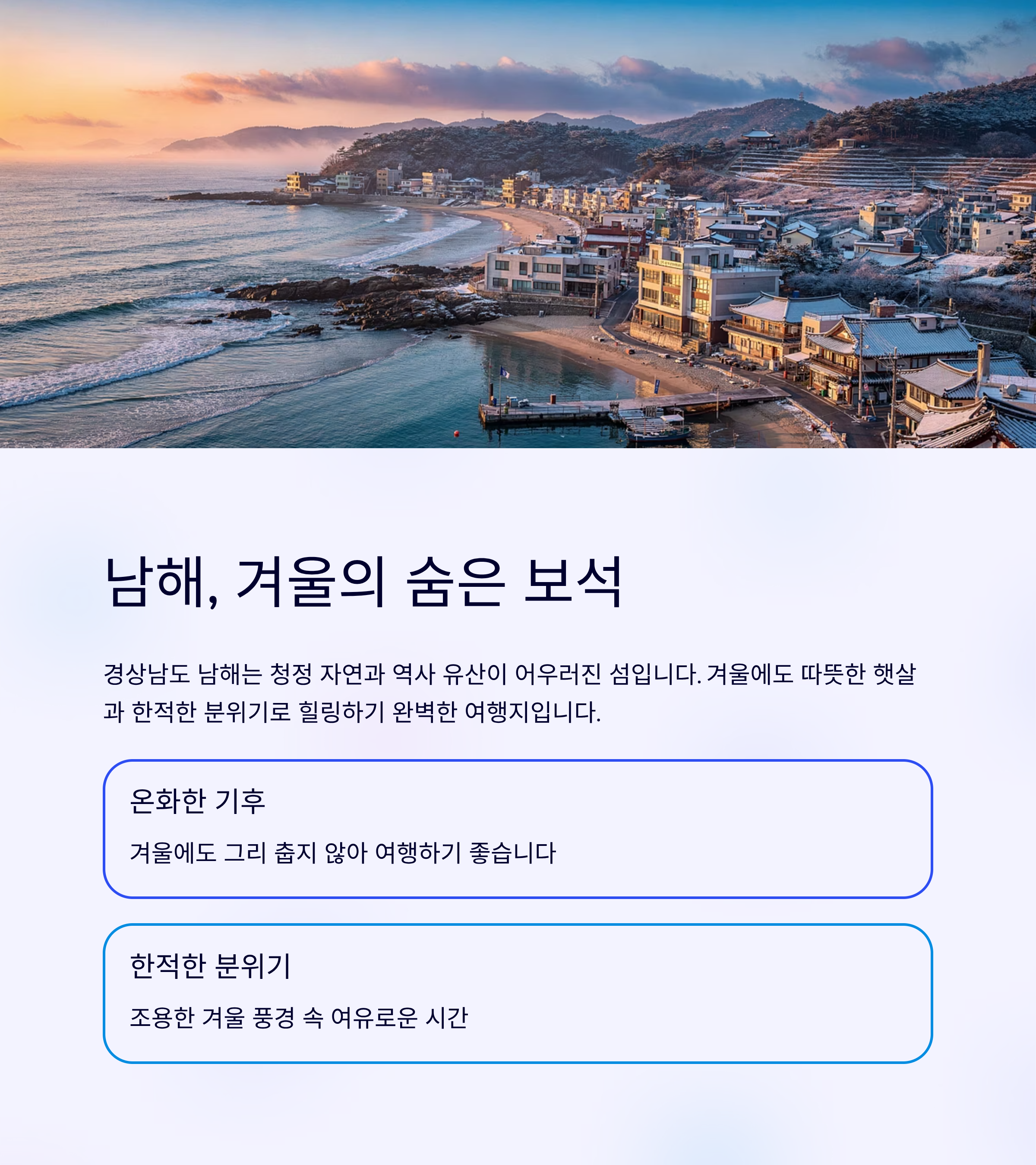 남해는 겨울에도 그 아름다운 자연과 고즈넉한 풍경 덕분에 여행지로서 많은 매력을 지니고 있습니다. 바다와 산을 함께 즐기며 겨울의 정취를 느낄 수 있는 다양한 여행지를 소개했습니다. 각 지역에서의 산책, 트레킹, 그리고 맛집 탐방은 남해에서의 특별한 겨울 여행을 완성시킬 것입니다.