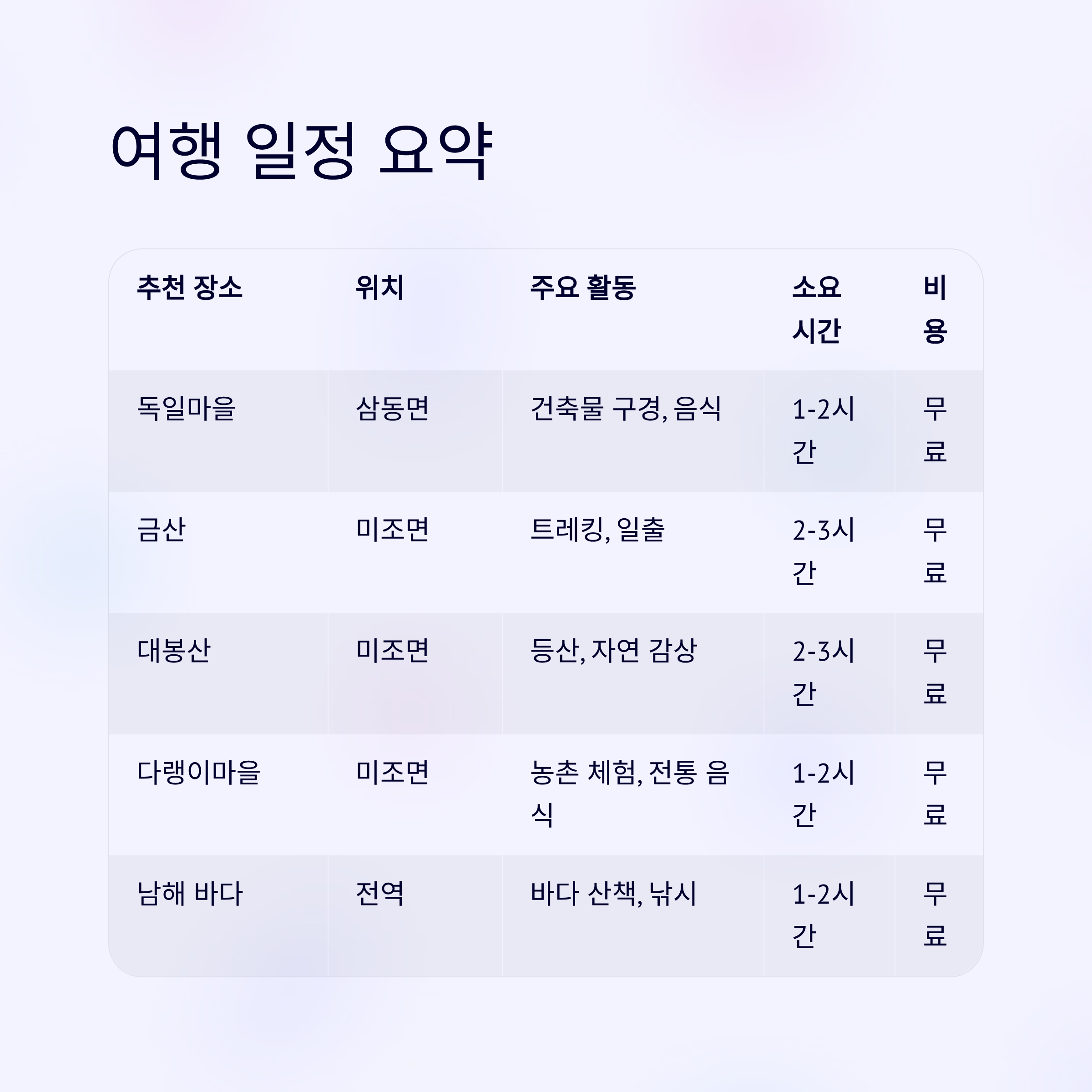 추천 장소위치주요 활동예상 소요 시간예상 비용