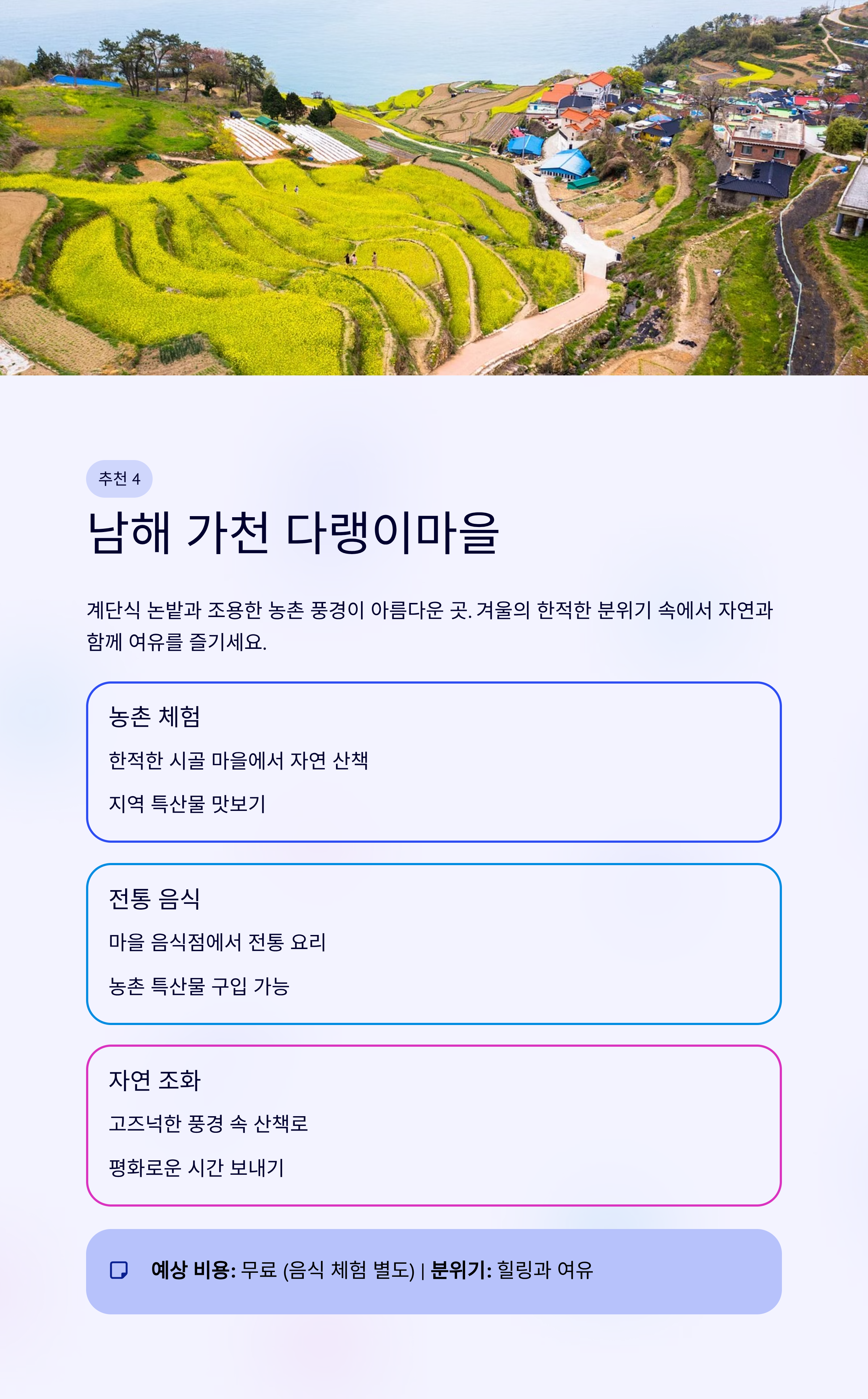 “가천 다랭이마을에서의 겨울 여행은 정말 힐링이었어요. 마을의 고즈넉한 분위기 속에서 자연을 느끼고, 조용한 시간을 보낼 수 있었습니다.”
