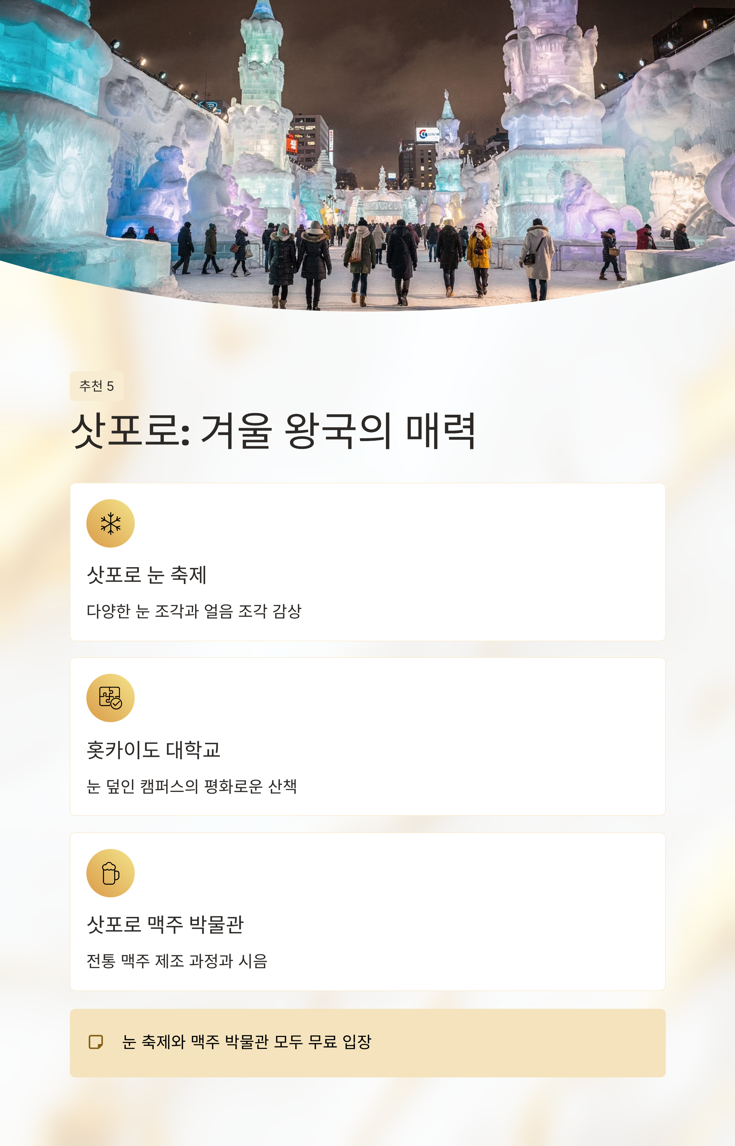 “삿포로에서의 설날은 정말 매력적이었습니다. 눈 축제에서 본 얼음 조각과 맥주 박물관에서의 경험은 특별한 여행이었어요.”