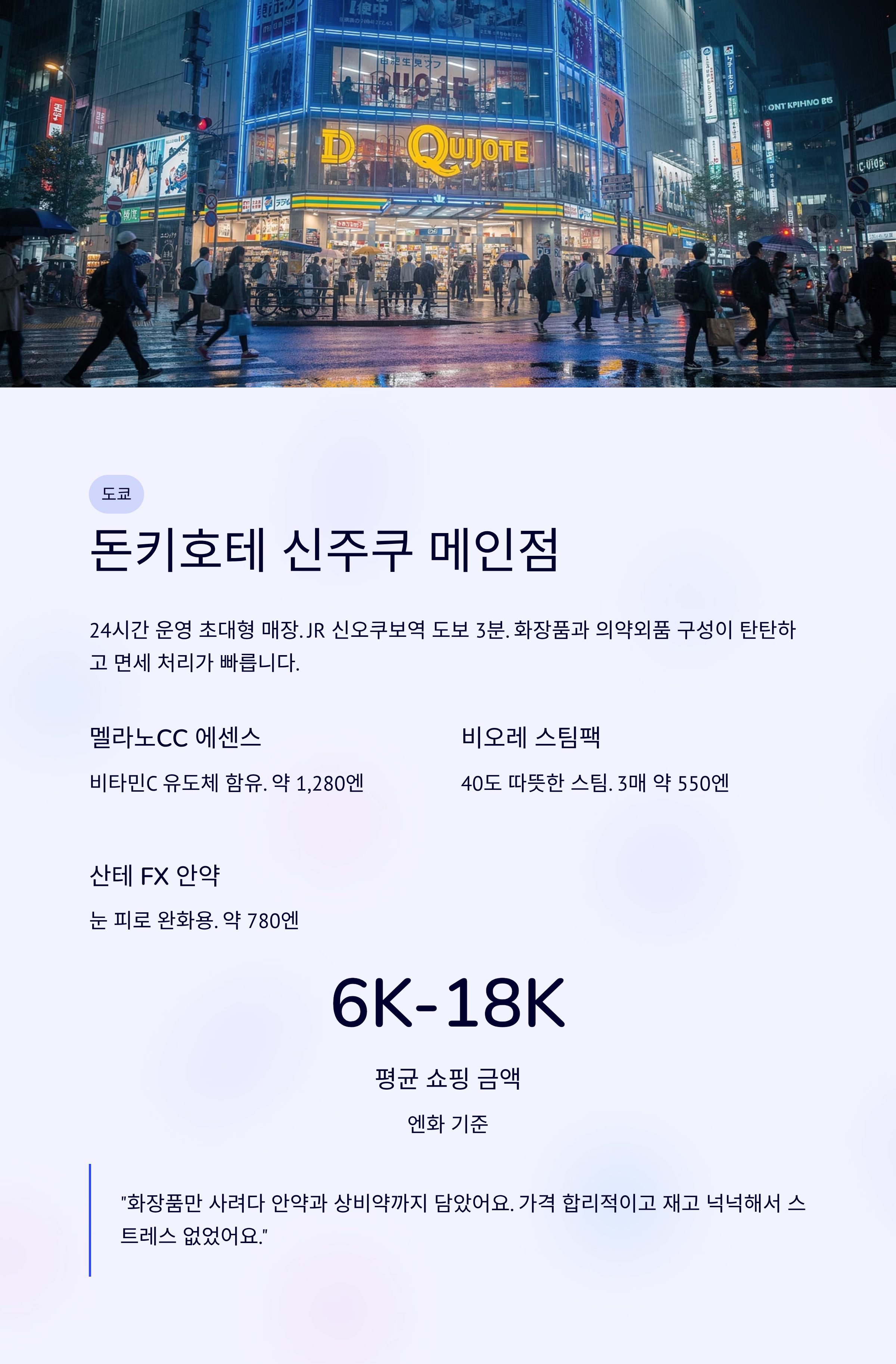 “화장품만 사려고 들어갔다가 안약이랑 상비약까지 다 담게 됐어요. 가격도 합리적이고 재고가 넉넉해서 스트레스 없이 쇼핑했어요.”신주쿠 주변 맛집 카페 추천