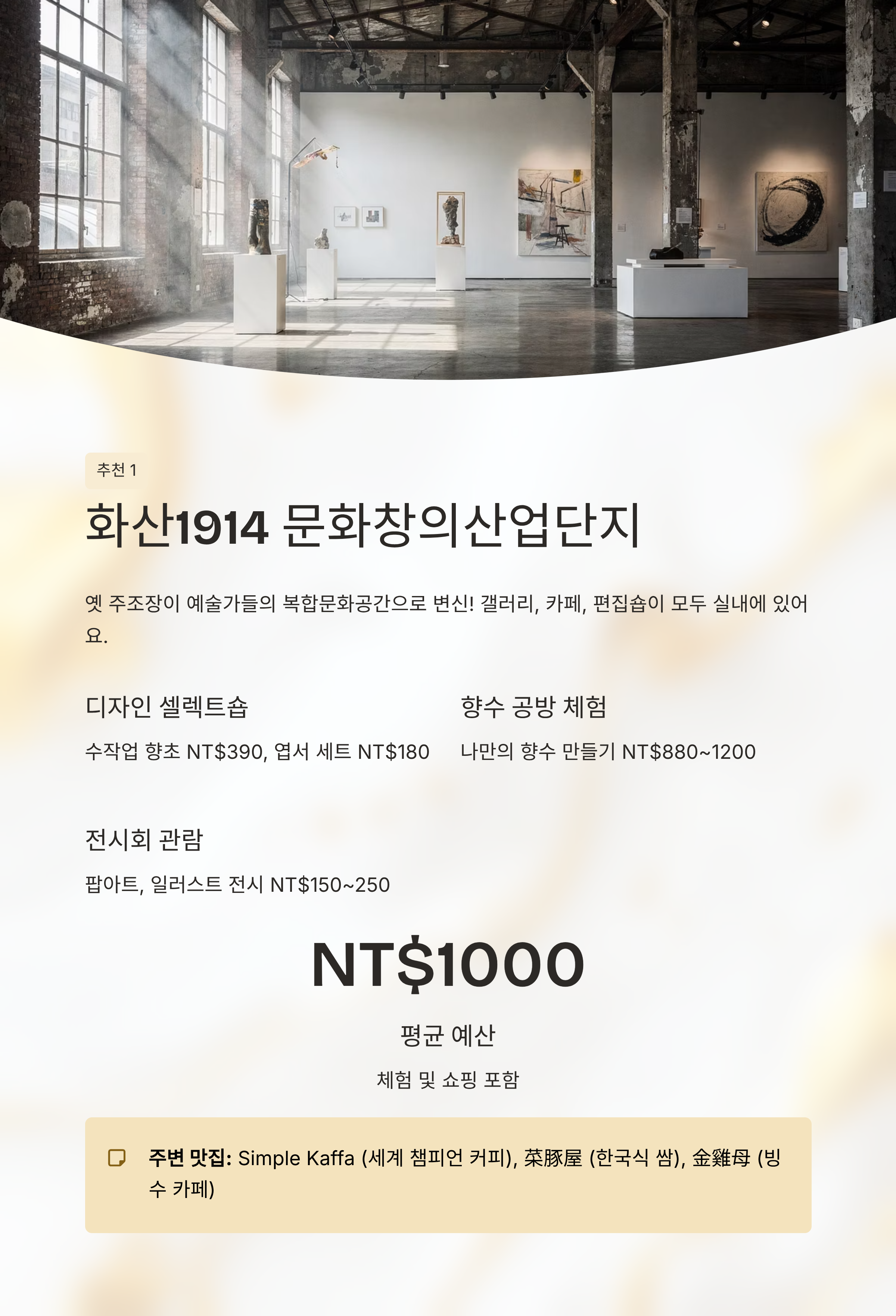 옛날 주조장이었던 공간이 현재는 타이완 젊은 예술가들과 디자이너들의 감각적인 작품으로 가득한 복합문화공간으로 탈바꿈했어요. 갤러리, 카페, 편집숍, 공방이 모두 실내에 모여 있어 비 오는 날엔 더 매력적인 장소입니다.즐길거리 상세 소개