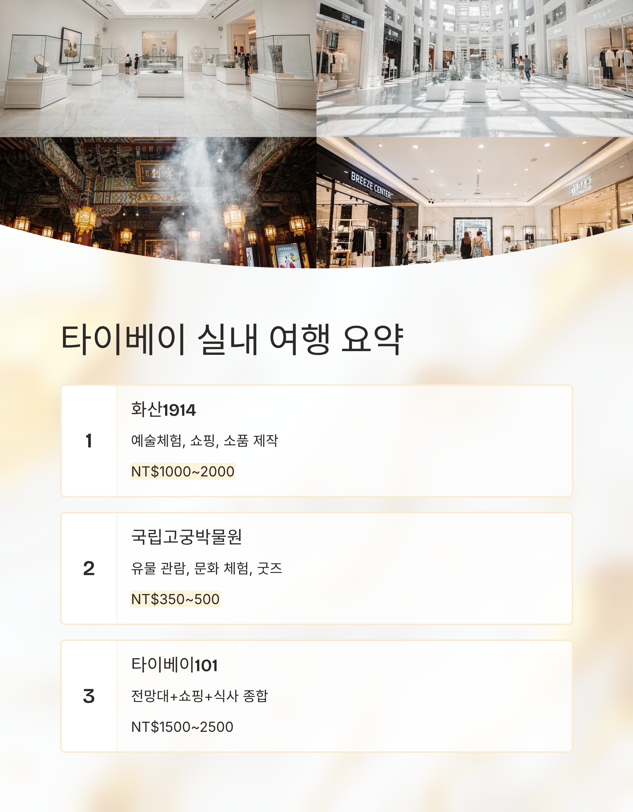 화산1914 예술체험, 쇼핑, 소품 제작 전부 실내 NT$1000~2000 국립고궁박물원 유물 관람, 문화 체험, 굿즈 쇼핑 전부 실내 NT$350~500 타이베이101 전망대+쇼핑+식사 종합코스 전부 실내 NT$1500~2500