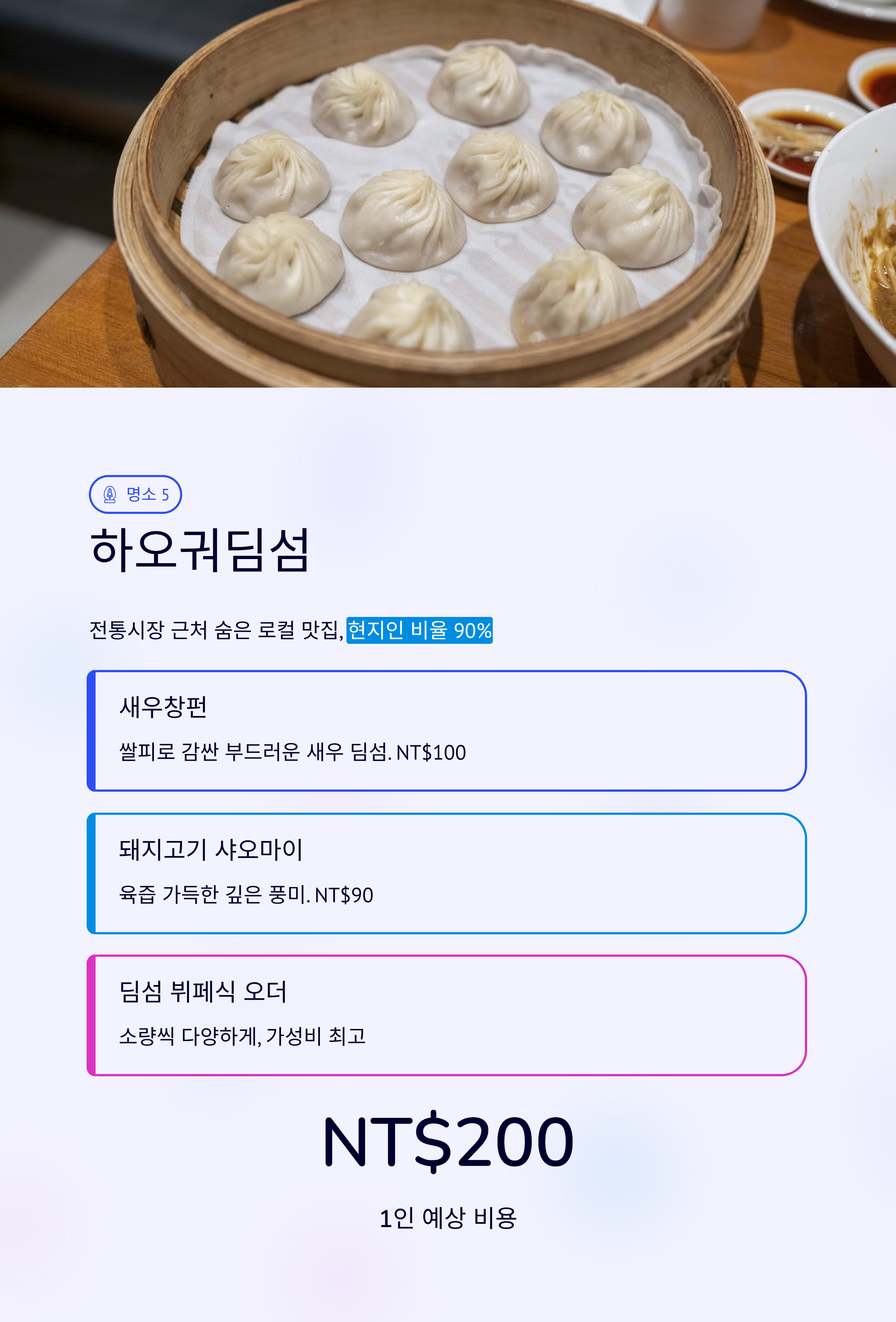 대만 타이베이는 미식가들의 천국이에요. 그중에서도 ‘딤섬’은 현지인뿐만 아니라 전 세계 관광객들에게 사랑받는 대표 음식이죠. 오늘은 SNS와 최신 미식 트렌드를 바탕으로 타이베이에서 딤섬 맛집 5곳을 선정해 추천 장소, 대표 메뉴, 위치, 체험 포인트, 포토스팟, 체험후기, 주변 맛집까지 완벽 정리했습니다.
