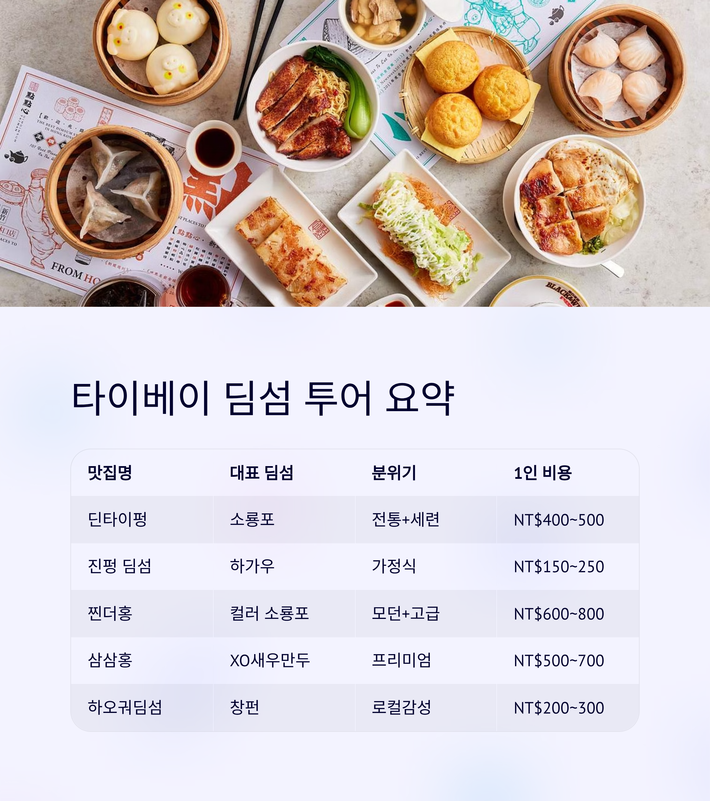 딘타이펑 본점 소룡포, 볶음밥 전통+세련 NT$400~500 진펑 딤섬 하가우, 차슈바오 가정식 NT$150~250 찐더홍 컬러 소룡포, 디저트 딤섬 모던+고급 NT$600~800 삼삼홍 XO새우만두, 커스터드번 프리미엄 NT$500~700 하오궈딤섬 창펀, 샤오마이 로컬감성 NT$200~300