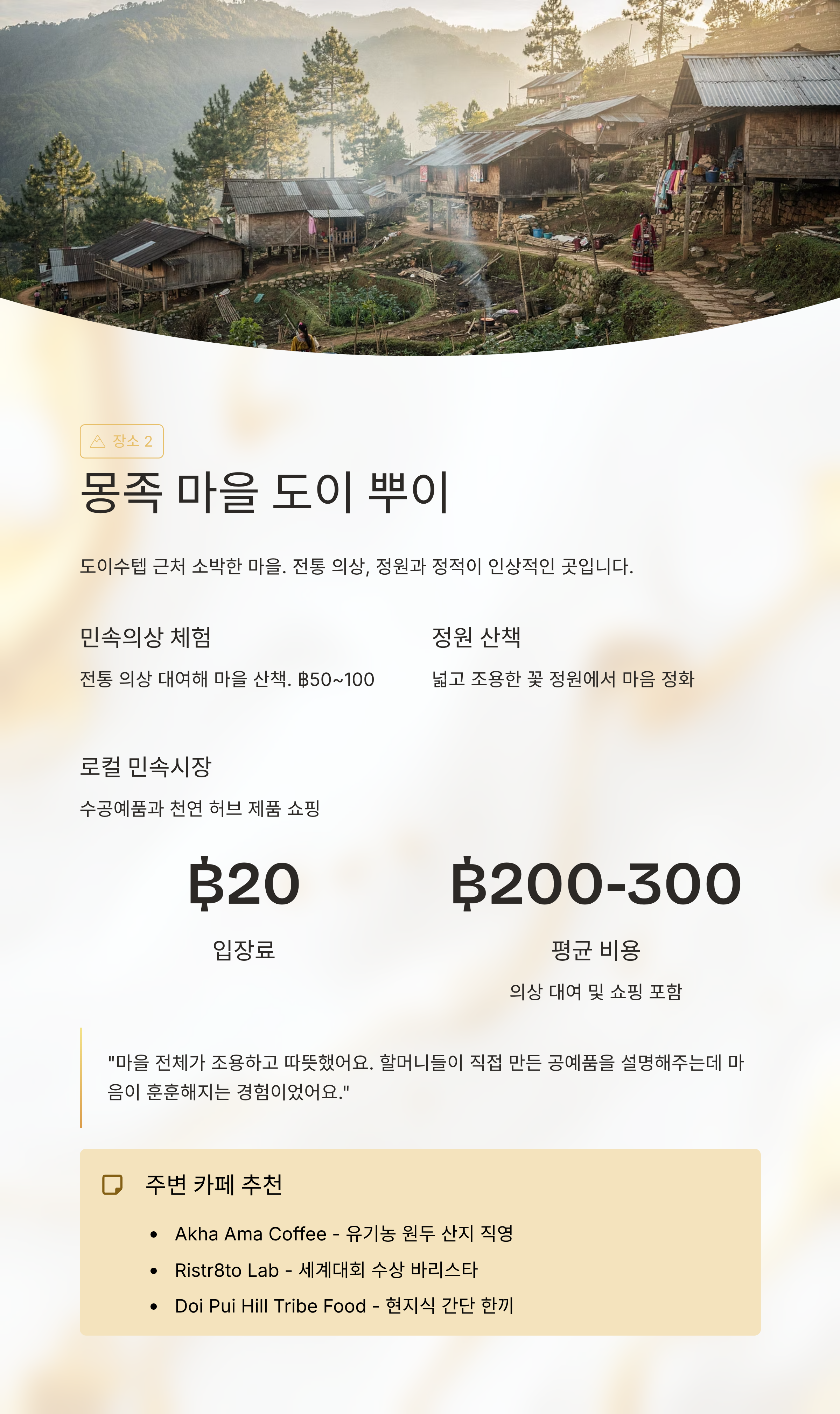 “마을 전체가 조용하고 따뜻했어요. 할머니들이 직접 만든 공예품을 설명해주는데 마음이 훈훈해지는 경험이었어요.”주변 맛집&카페 추천