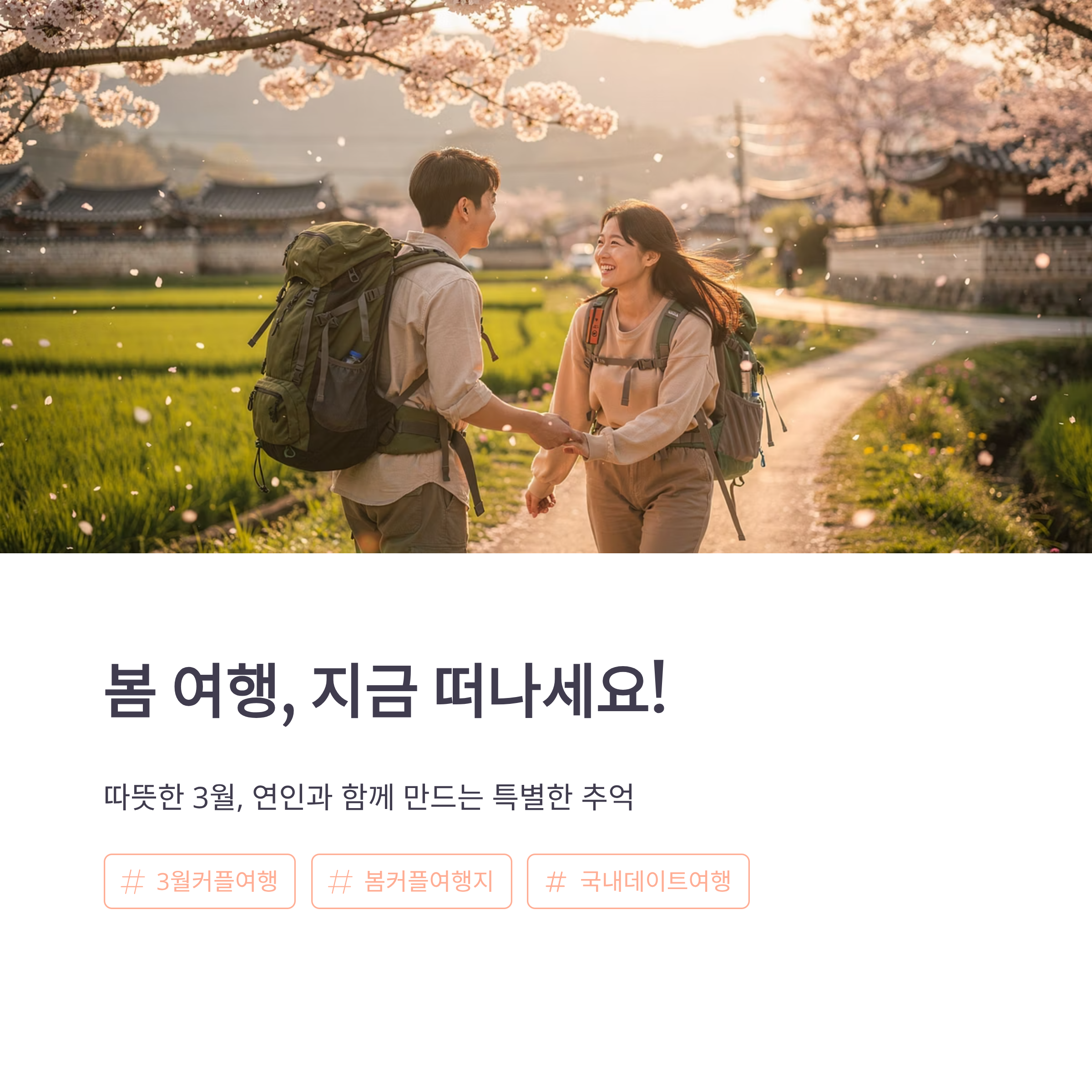 3월은 겨울의 차가움이 사라지고, 봄 특유의 부드러운 공기와 햇살이 느껴지는 시기입니다. 본격적인 벚꽃 시즌 전이라 비교적 여유롭게 여행을 즐길 수 있어 커플 여행지로 특히 인기가 많아요. 이번 글에서는 최근 SNS와 여행 커뮤니티에서 커플 데이트 코스로 많이 언급되는 봄 감성 가득한 국내 여행지 5곳을 소개합니다. 분위기, 즐길거리, 포토스팟, 맛집까지 꼼꼼히 정리했으니 3월 여행 계획에 참고해 보세요.