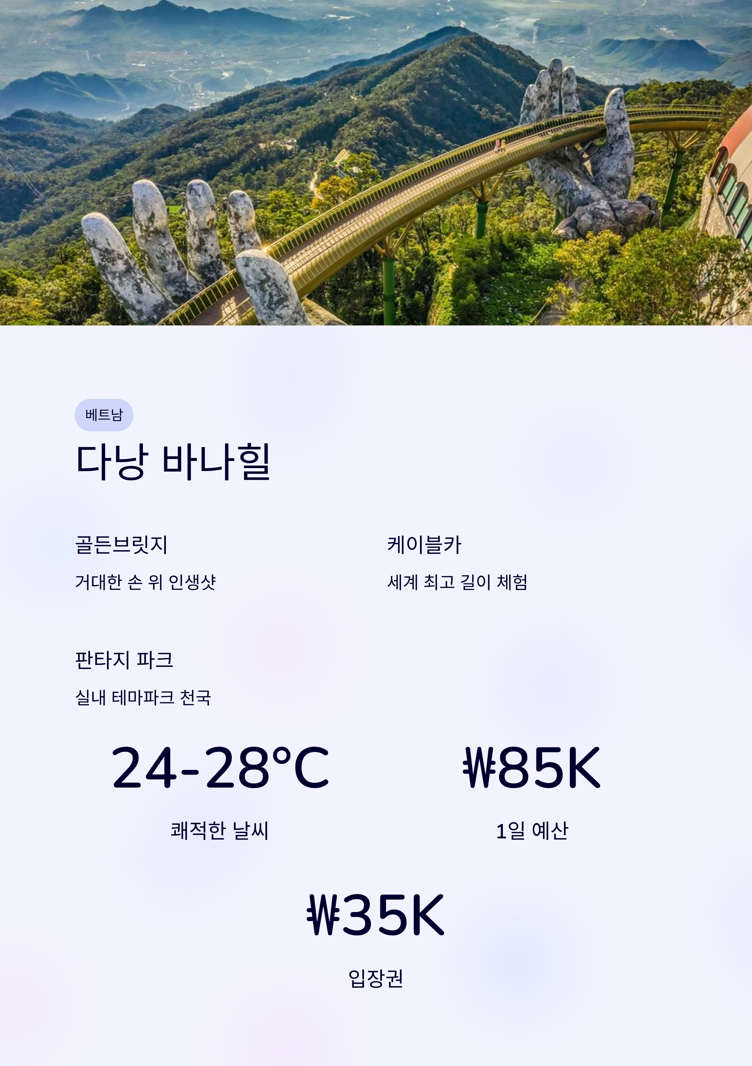 날씨 24~28도, 건기 25~34도, 건기 26~31도, 건기 특징 유럽풍 테마파크와 해변 사원 중심 힐링 도시 액티비티 중심 휴양지 추천장소 바나힐 도이수텝 사원 카와산 폭포 대표 즐길거리 골든브릿지, 케이블카, 테마파크 사원 관람, 전망대, 전통마을 체험 캐녀닝, 다이빙, 폭포 수영 주변 즐길거리 린응사, 선짜반도, 야시장 도이프이 국립공원, 동물원, 님만해민 모알보알, 온천, 람부그비치 포토스팟 골든브릿지, 프랑스빌리지 사원 계단, 금탑, 시내 전망 폭포, 캐녀닝, 다이빙샷 1일 예산 약 85,000원 약 60,000원 약 90,000원 추천 분위기 가족, 커플 여행 혼자 또는 힐링여행 친구, 커플 액티비티 여행