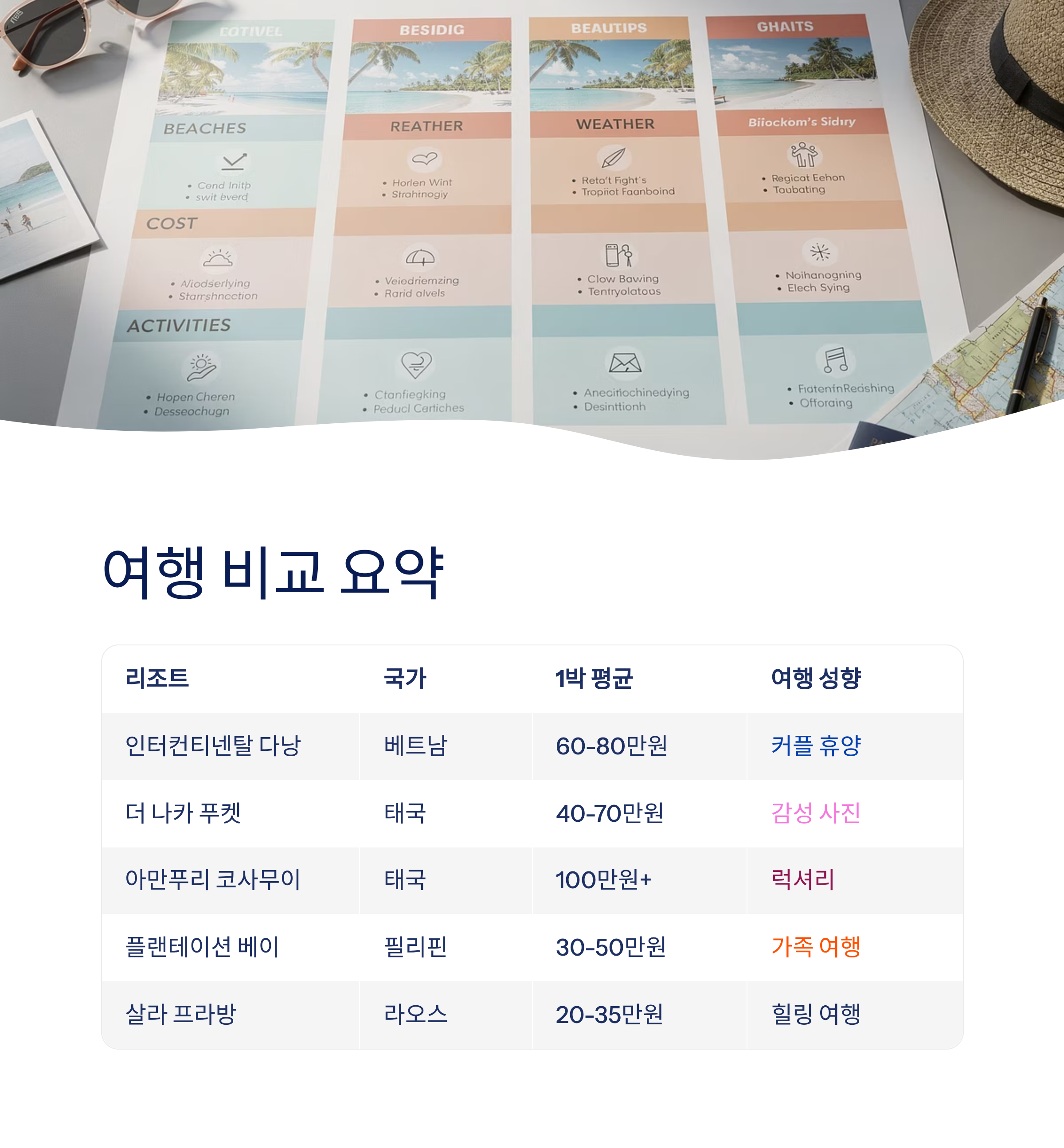 인터컨티넨탈 다낭 베트남 60~80만 원 커플 휴양 더 나카 푸켓 태국 40~70만 원 감성 사진 아만푸리 코사무이 태국 100만 원 이상 럭셔리 플랜테이션 베이 필리핀 30~50만 원 가족 여행 살라 프라방 라오스 20~35만 원 힐링 여행