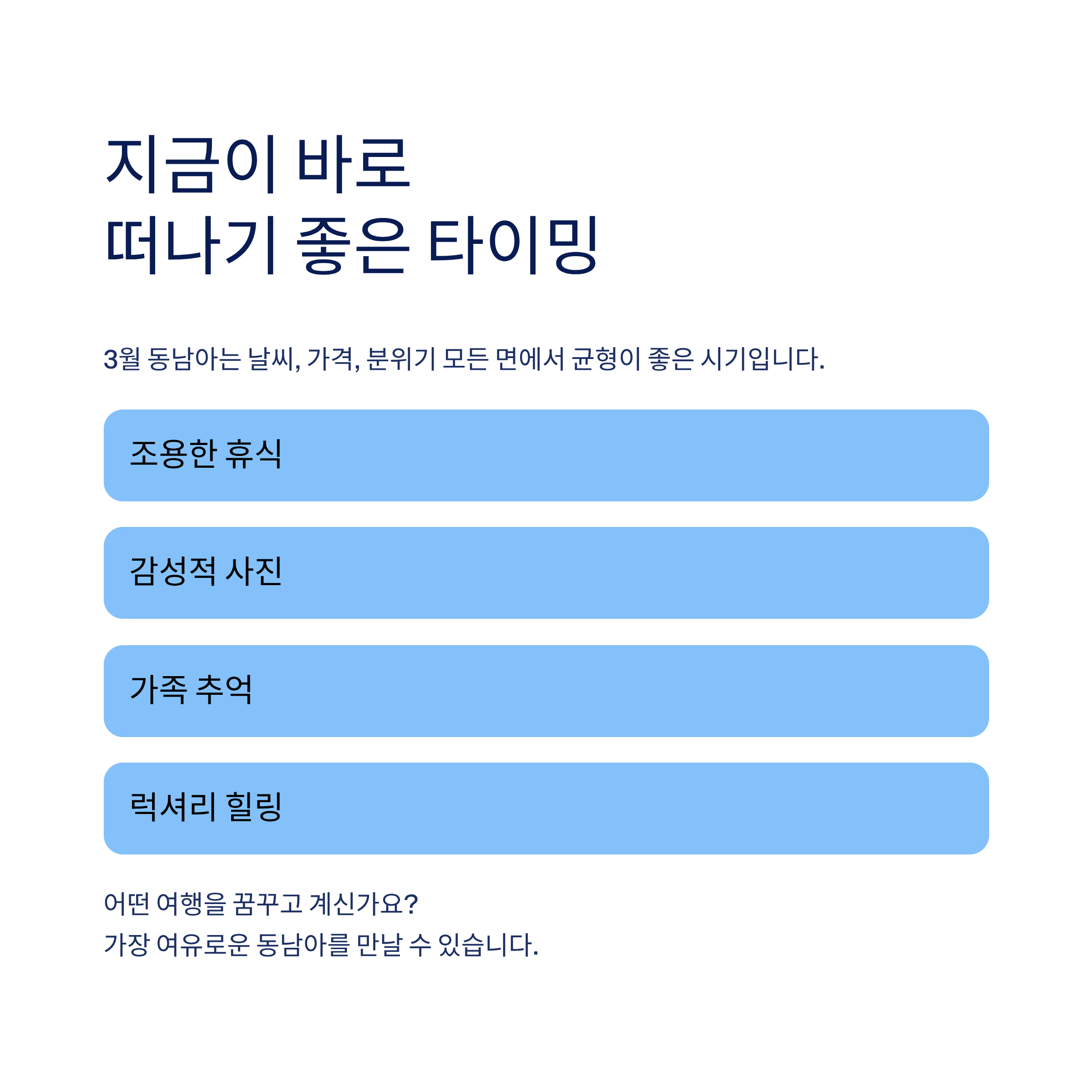 3월의 동남아는 여행자에게 가장 이상적인 시기입니다. 건기 후반으로 날씨가 안정적이고, 바다는 맑으며 습도도 비교적 낮아 휴양과 액티비티 모두 만족도가 높습니다. 무엇보다 성수기 직전이라 항공권과 리조트 가격이 상대적으로 합리적인 편이죠.