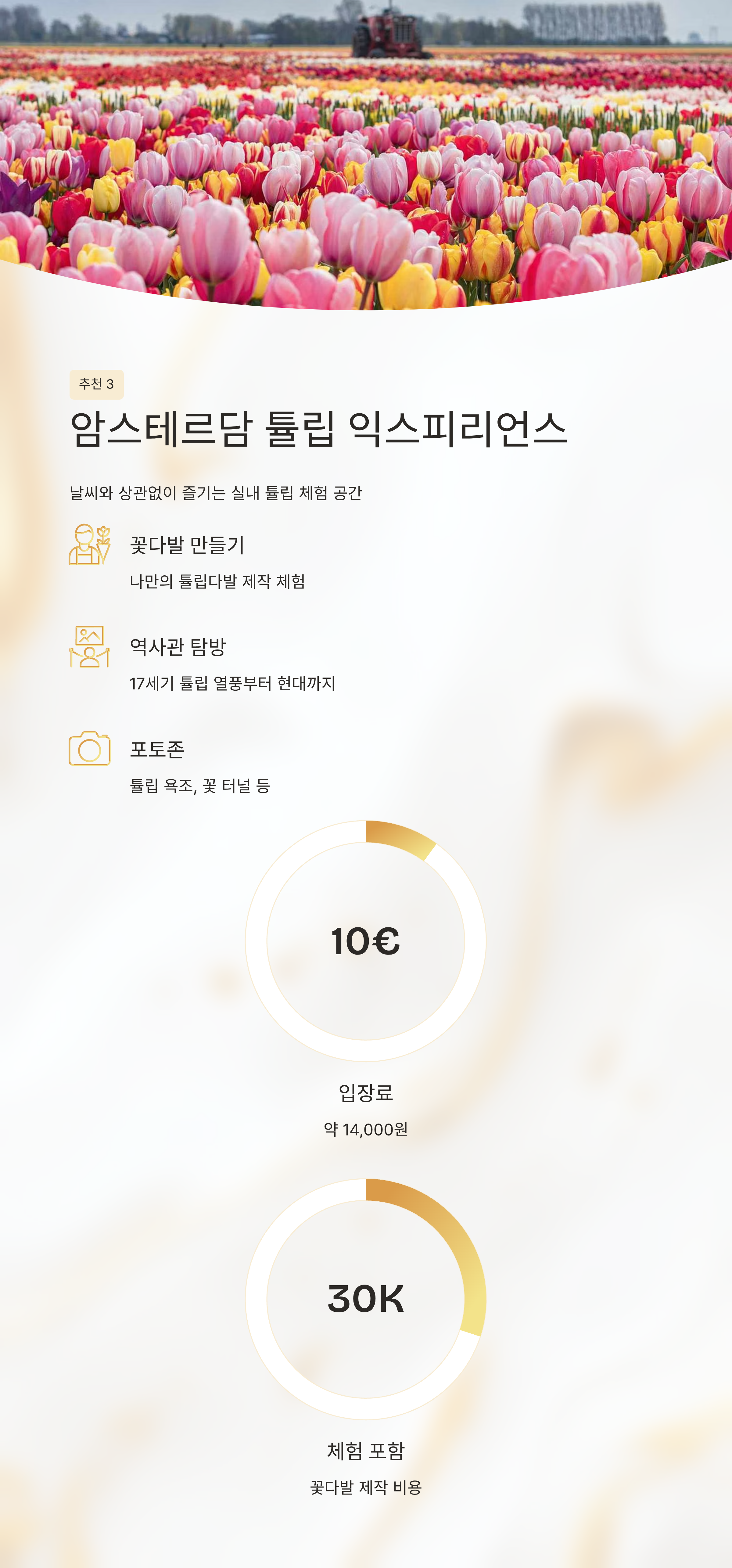큐켄호프 3.15~5.10 세계 최대 꽃 정원, 보트투어 박물관, 전통 풍차, 시장 약 5~6만 원 블로멘다알 3.20~5.01 꽃밭 자전거 투어, 농장 체험 드론 체험, 전통의상 체험 약 4~5만 원 튤립 익스피리언스 3.15~5.10 실내 꽃체험, DIY 꽃다발 해변 산책, 시내 투어 약 3~4만 원