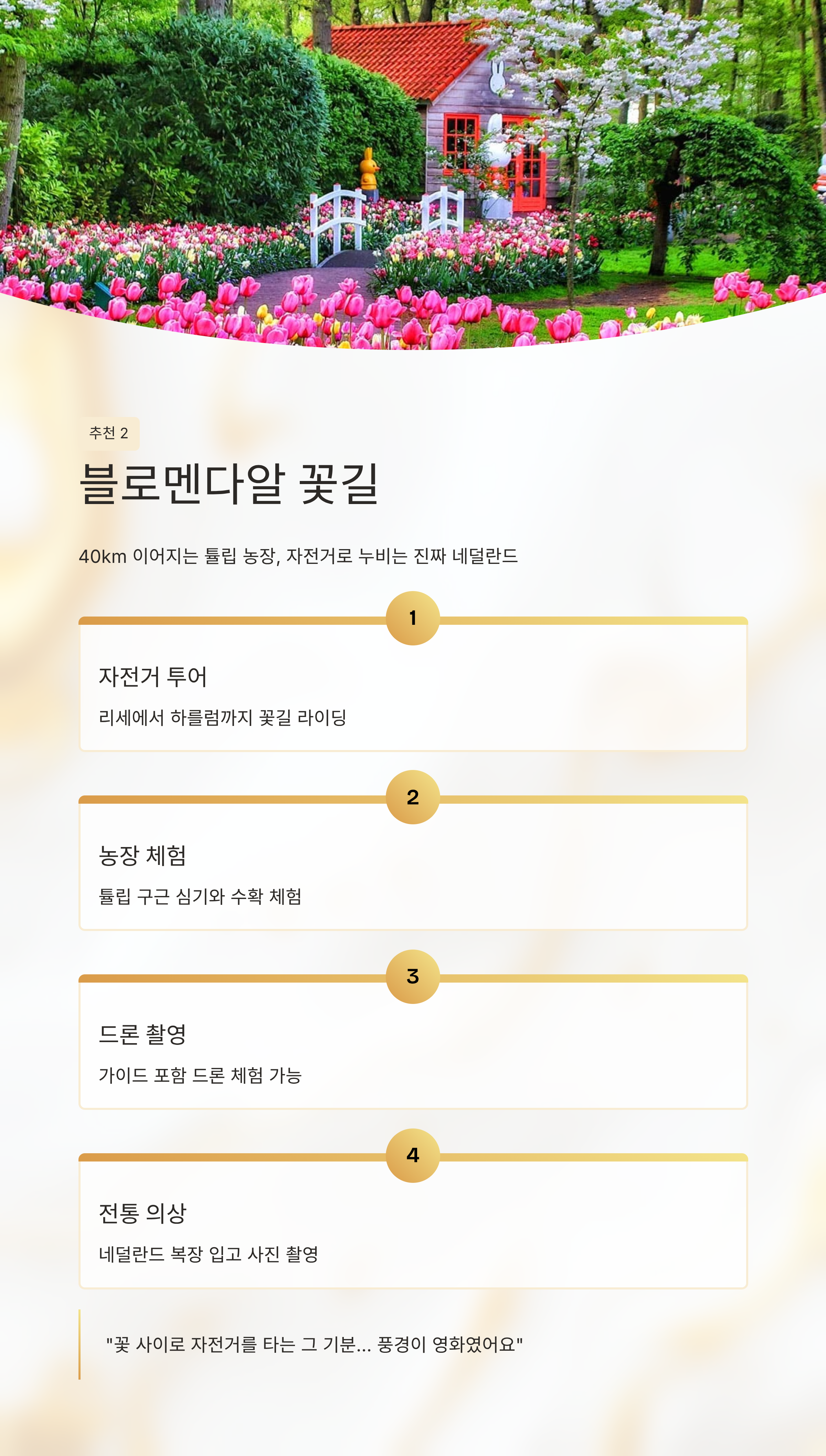 “꽃 사이로 자전거를 타는 그 기분… 말로 표현이 안 돼요. 음악도 필요 없었고, 풍경이 영화였어요.”맛집 추천