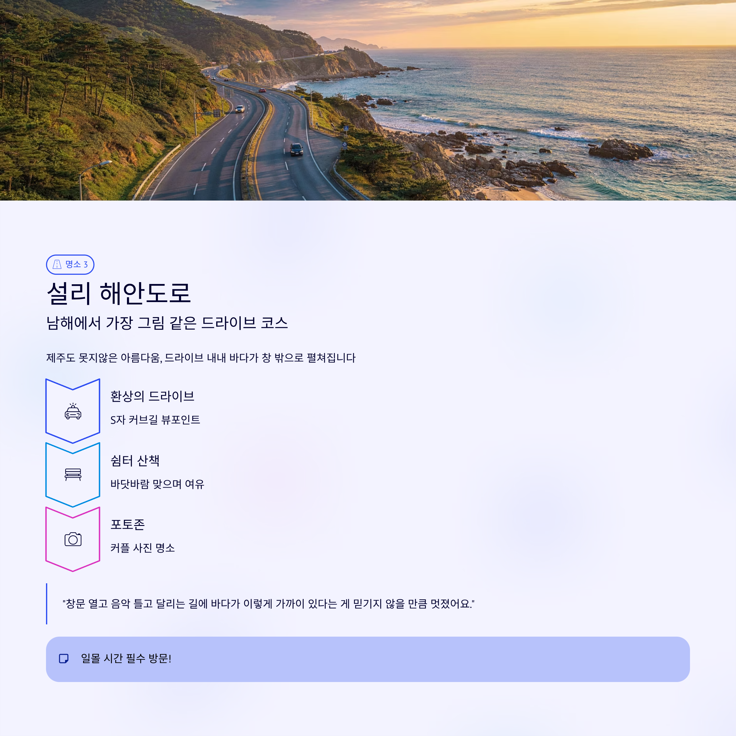 이 글에서는 남해의 대표 드라이브 명소 세 곳을 중심으로, 그 주변에서 함께 즐길 수 있는 ‘체험형 즐길거리’까지 더해 풍성하게 소개합니다.