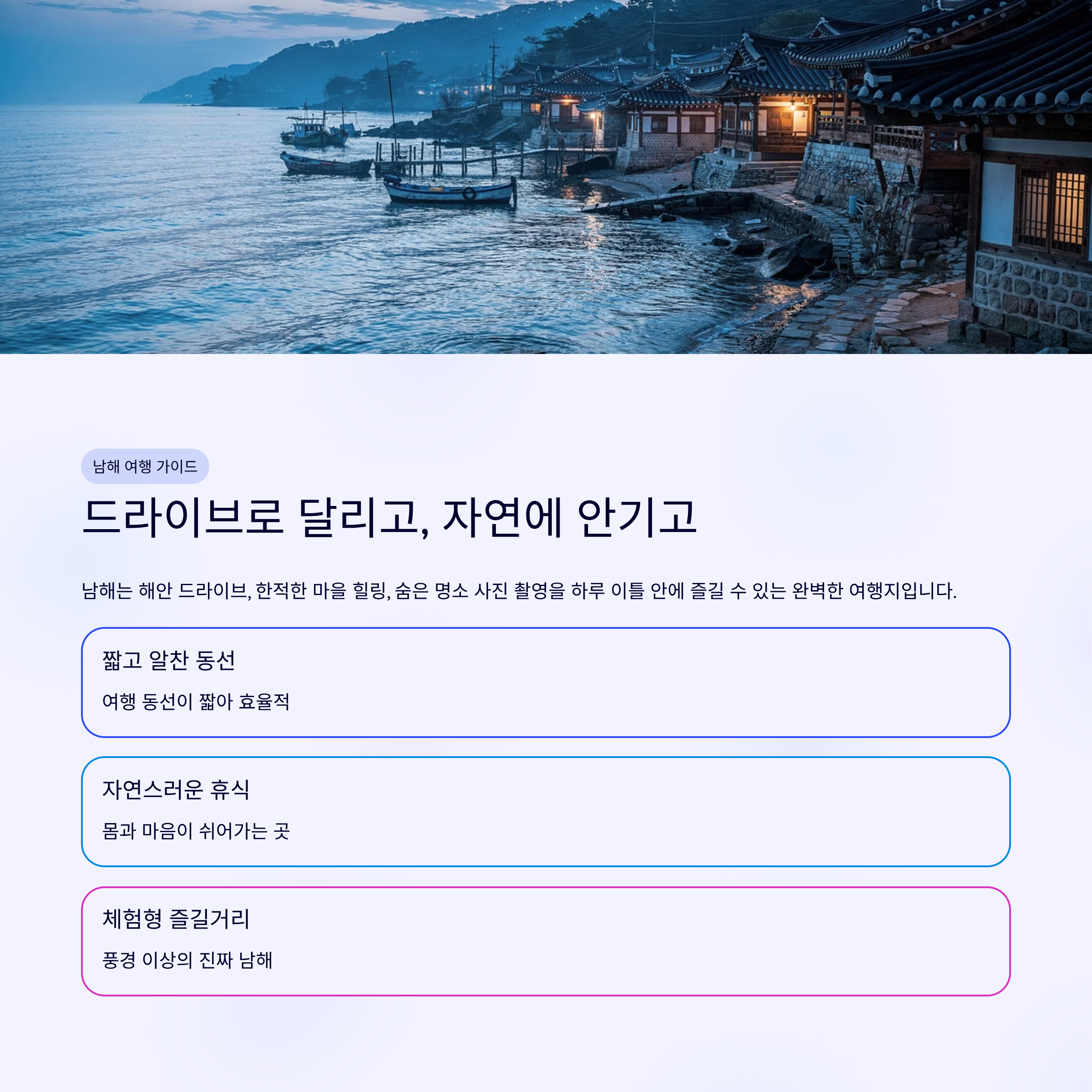 그런 모든 여정을 하루 이틀 안에 소화할 수 있을 만큼, 남해는 여행 동선이 짧고 알차며 무엇보다 ‘자연스럽게 쉬게 되는 곳’입니다.