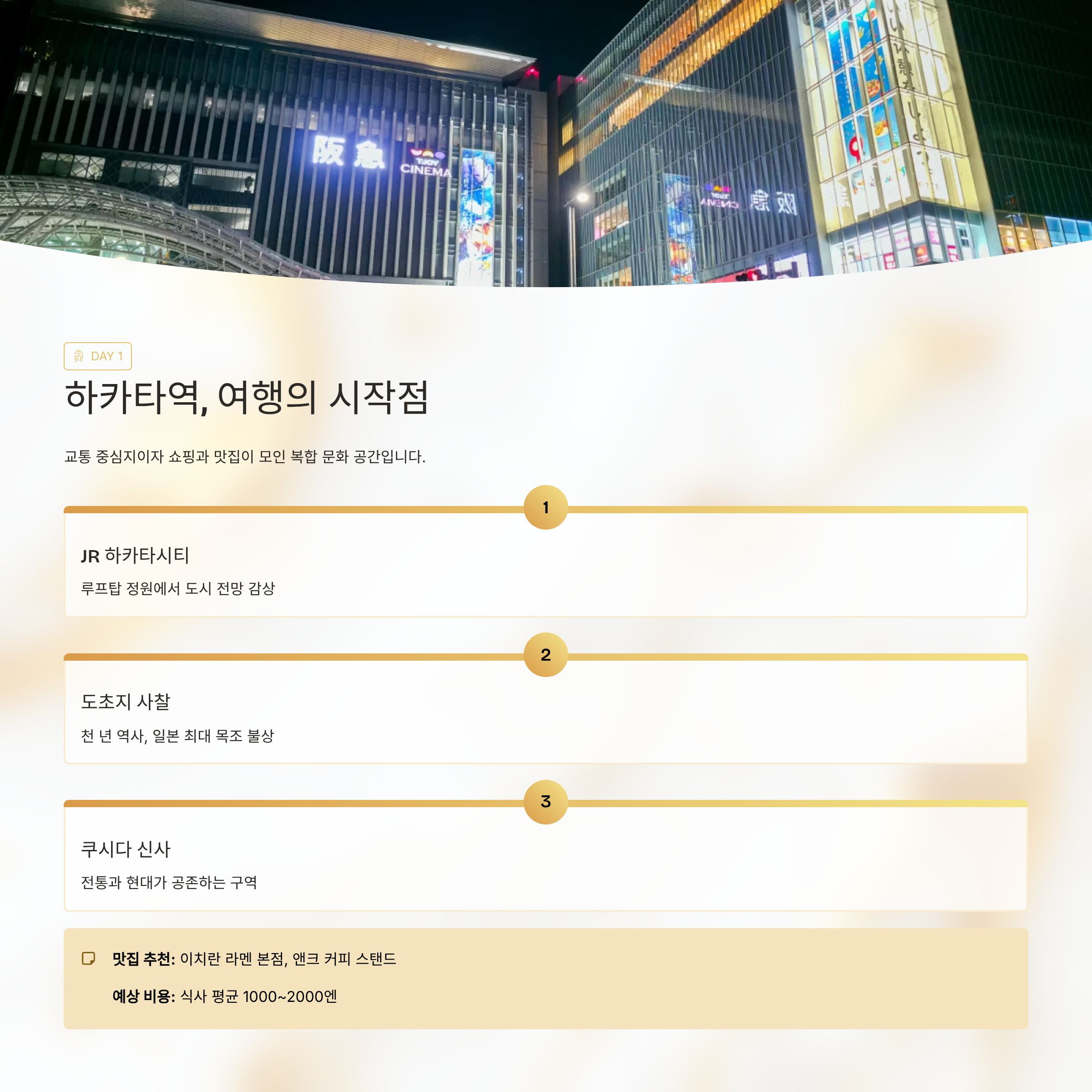 "여행 첫날과 마지막 날 모두 하카타역에서 시작했어요. 너무 편리하고 즐길 거리가 많아서 놀랐어요."주변 관광지 상세 소개