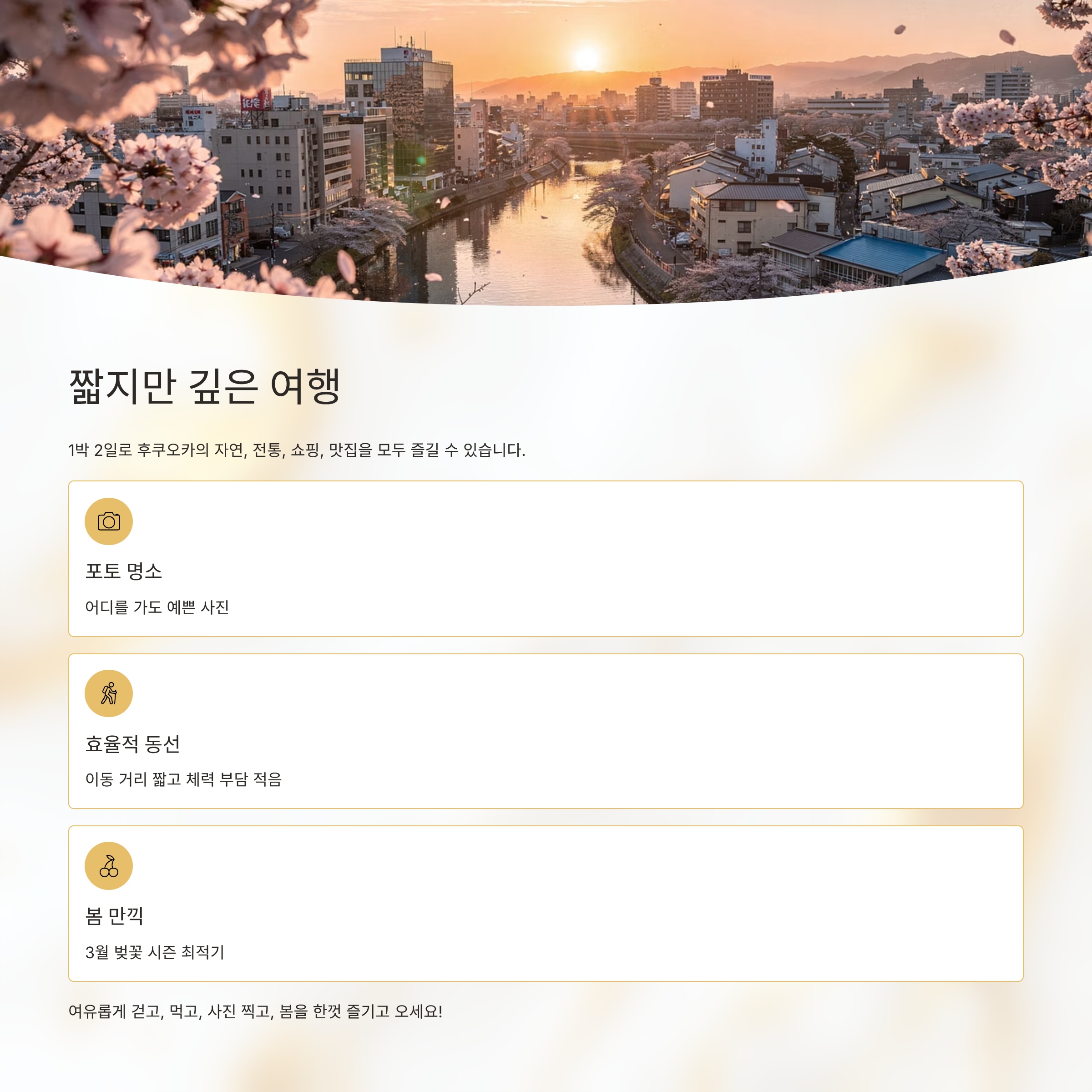 1박 2일이라는 짧은 시간이지만 후쿠오카는 매력적인 코스로 가득한 도시입니다. 벚꽃 시즌인 3월은 어디를 가도 사진이 예쁘게 나오고, 자연과 전통, 쇼핑과 맛집까지 모두 즐길 수 있어요. 이번 코스를 따라 움직인다면 "짧지만 깊은" 여행을 충분히 경험하실 수 있을 거예요. 무엇보다 이동 거리가 짧고 효율적이어서 체력 부담도 적습니다. 여유롭게 걷고, 먹고, 사진 찍고, 봄을 한껏 즐기고 오세요!