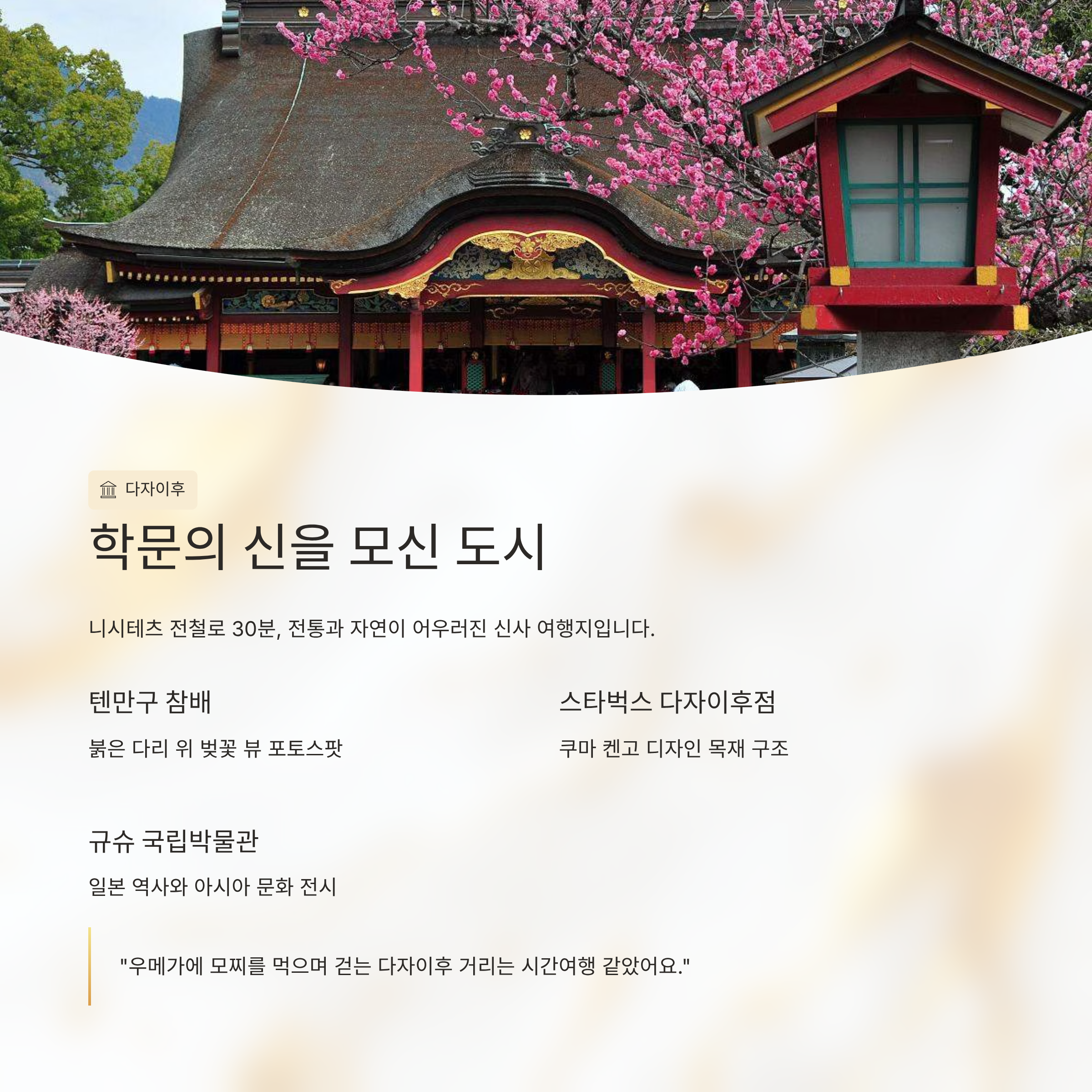 "우메가에 모찌를 먹으며 걷는 다자이후 거리는 시간여행을 하는 기분이었어요."주변 관광지 상세 소개