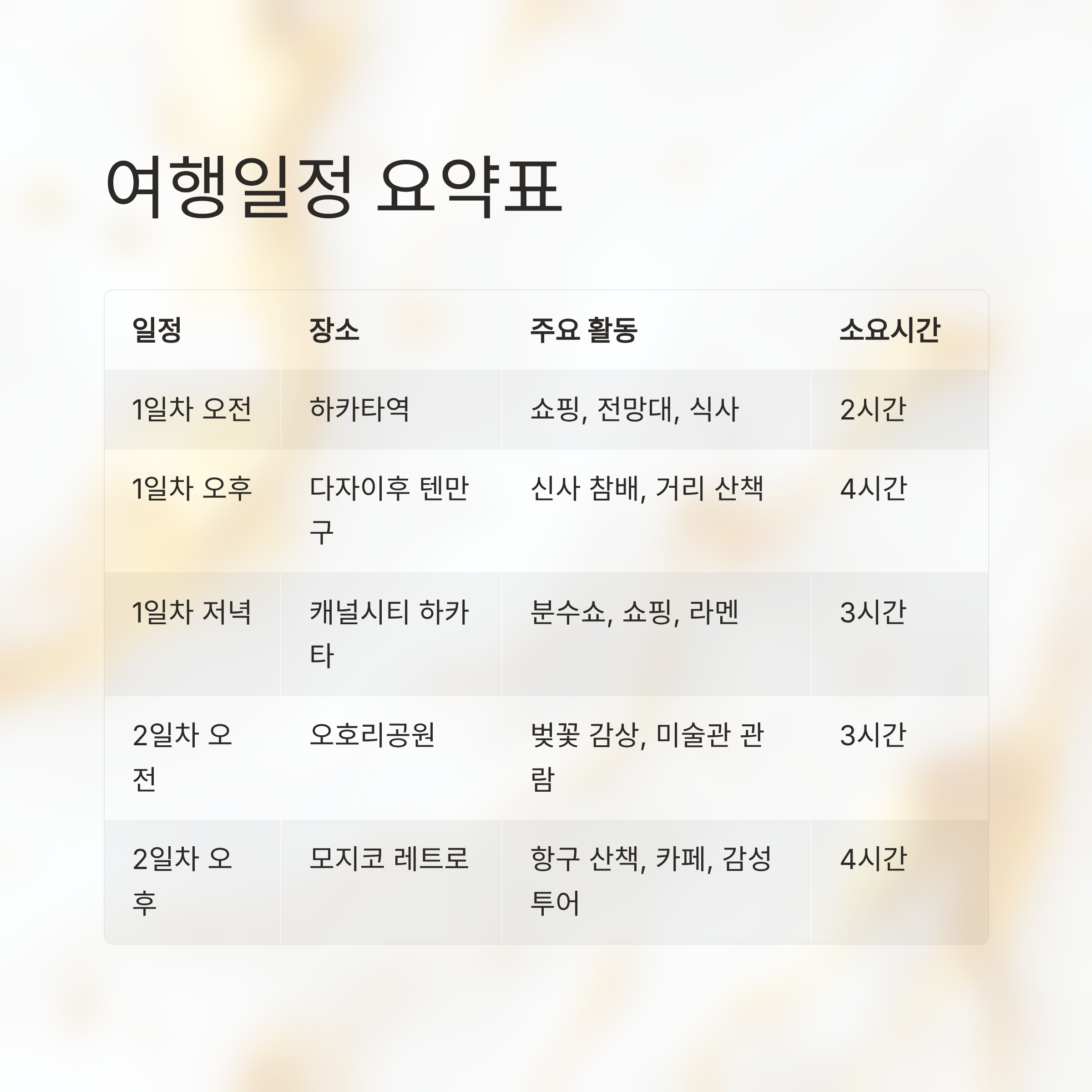 1일차 오전 하카타역 쇼핑, 전망대, 식사 2시간 1일차 오후 다자이후 텐만구 신사 참배, 거리 산책 4시간 1일차 저녁 캐널시티 하카타 분수쇼, 쇼핑, 라멘 3시간 2일차 오전 오호리공원 벚꽃 감상, 미술관 관람 3시간 2일차 오후 모지코 레트로 항구 산책, 카페, 감성투어 4시간