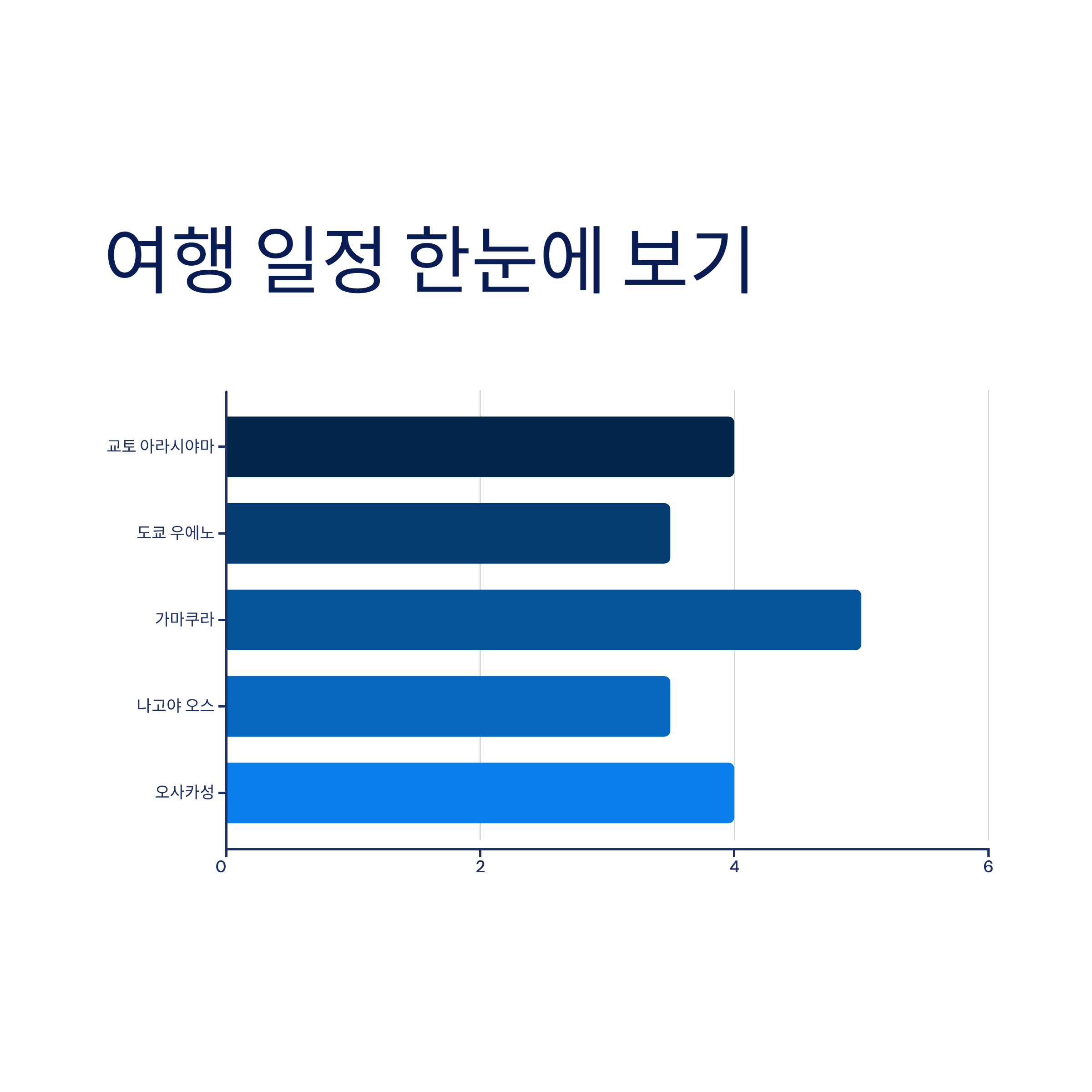 교토 아라시야마 대나무숲, 인력거, 정원 산책 4시간 이상 도쿄 우에노 공원 벚꽃 피크닉, 박물관 관람 3~4시간 가마쿠라 고토쿠인 대불 관광, 전차 타기, 해변 산책 5시간 이상 나고야 오스 상점가 쇼핑, 먹방, 절 방문 3~4시간 오사카 오사카성 공원 벚꽃 산책, 성 내부 관람, 보트 투어 4시간 이상