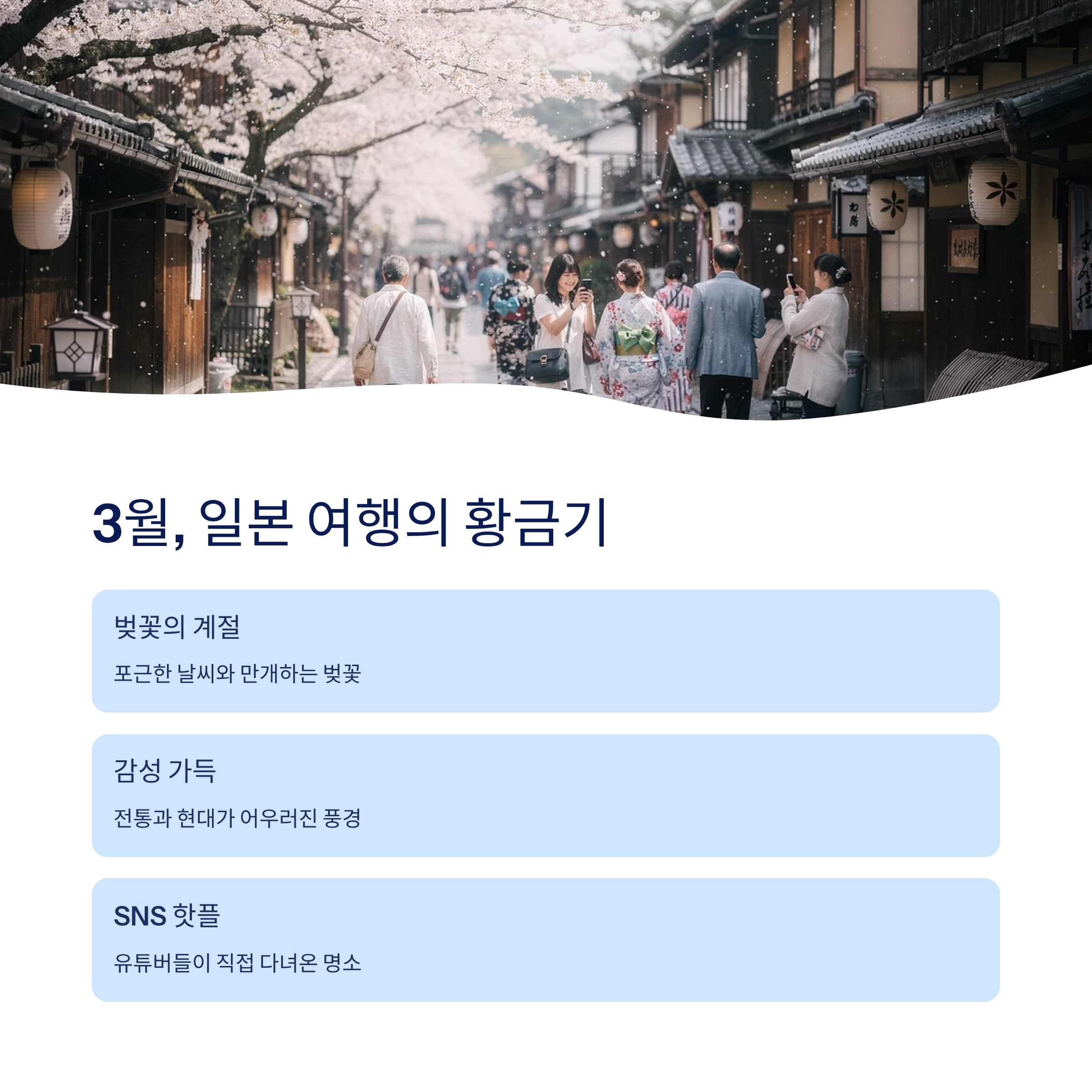 3월은 일본 여행에서 가장 아름다운 계절 중 하나로 꼽힙니다. 벚꽃이 피기 시작하고 날씨는 포근해지며, 걷기 좋은 풍경과 전통적인 거리 분위기가 어우러지죠. 특히 요즘 유튜브와 SNS를 통해 인기를 얻고 있는 장소들이 여행자들의 새로운 버킷리스트로 떠오르고 있어요. 이번 글에서는 유튜버들이 실제로 소개하고 다녀온 3월 일본 추천 여행지 5곳을 모아, 장소 소개부터 맛집, 포토스팟, 실사용 후기까지 완벽하게 정리해드립니다. 단기 여행에도 딱 맞는 현실적인 일정이니 그대로 따라해보셔도 좋아요.