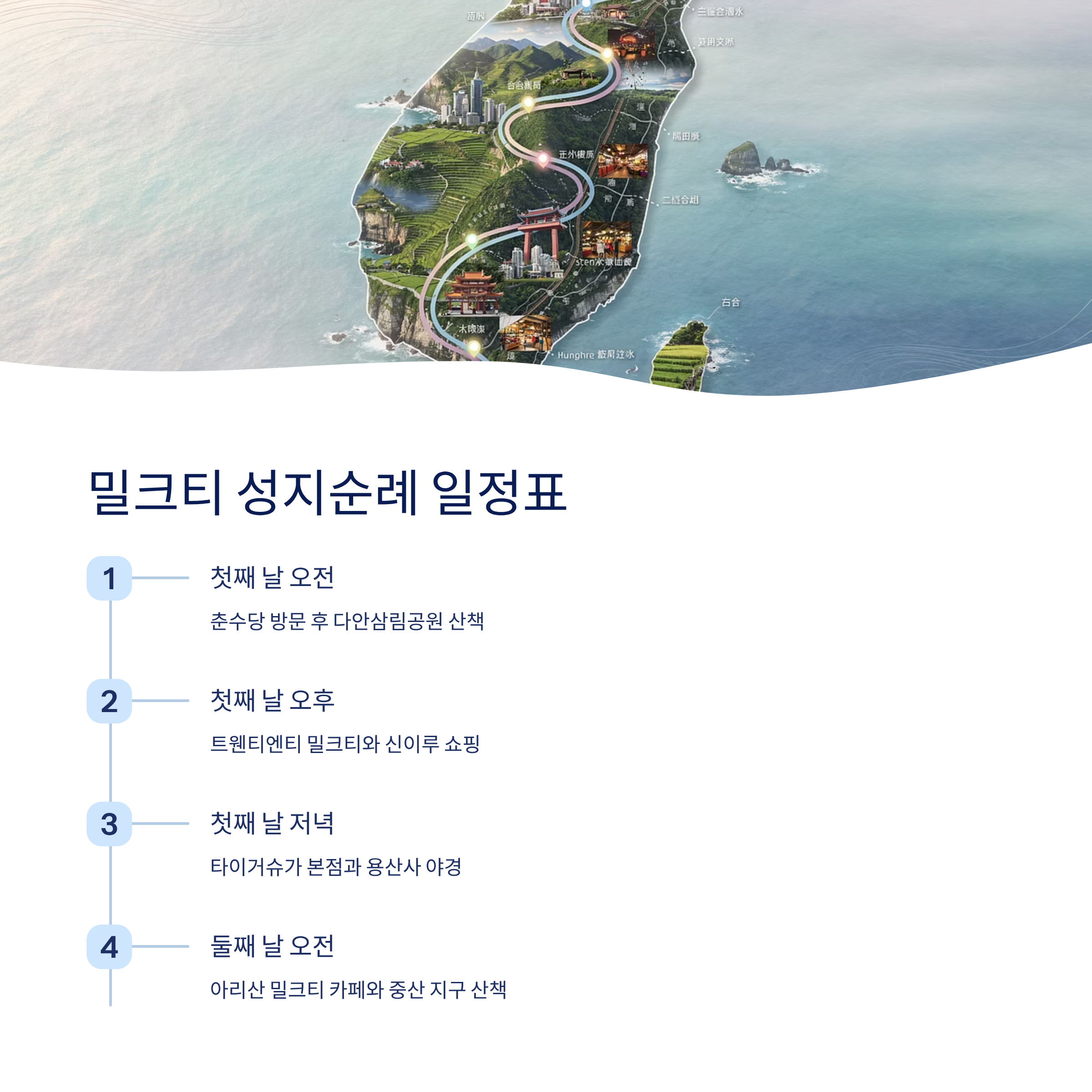 대만의 밀크티는 단순한 음료가 아니라 지역과 문화가 담긴 하나의 경험입니다. 3월은 신상 메뉴가 많이 나오는 시기이면서도 날씨가 부담스럽지 않아 밀크티 성지순례를 즐기기에 최적의 시즌이에요. 이번 코스는 실제 동선을 고려해 구성했기 때문에 그대로 따라가도 무리가 없습니다. 한 잔 한 잔 다른 개성을 가진 대만 밀크티를 즐기며, 여행의 달콤한 기억을 채워보시길 바랍니다.
