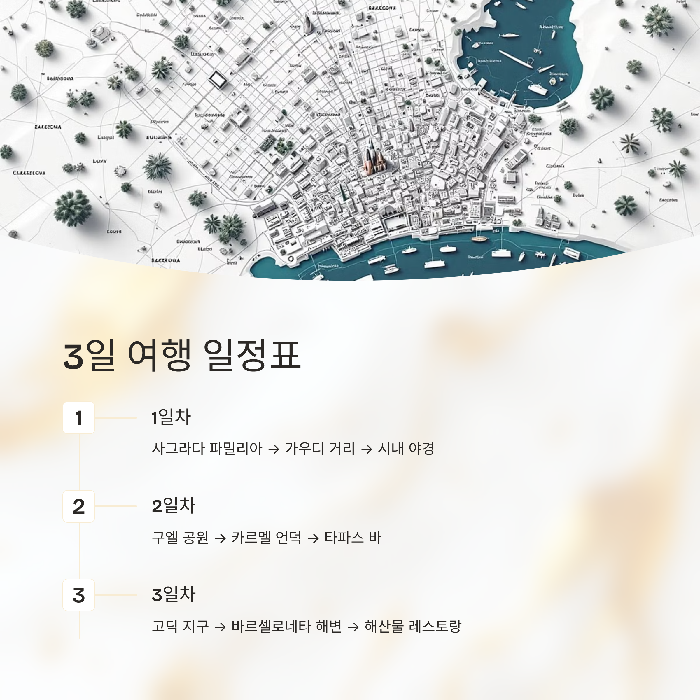 1일 차 사그라다 파밀리아 관람 가우디 거리 산책 + 근처 맛집 방문 시내 야경 & 레스토랑 디너 2일 차 구엘 공원 입장 & 트레킹 카르멜 언덕 or 예술 거리 탐방 타파스 바 or 야경 감성 바 3일 차 고딕 지구 골목길 산책 바르셀로네타 해변 산책 & 카페 투어 해산물 레스토랑 & 해변 일몰