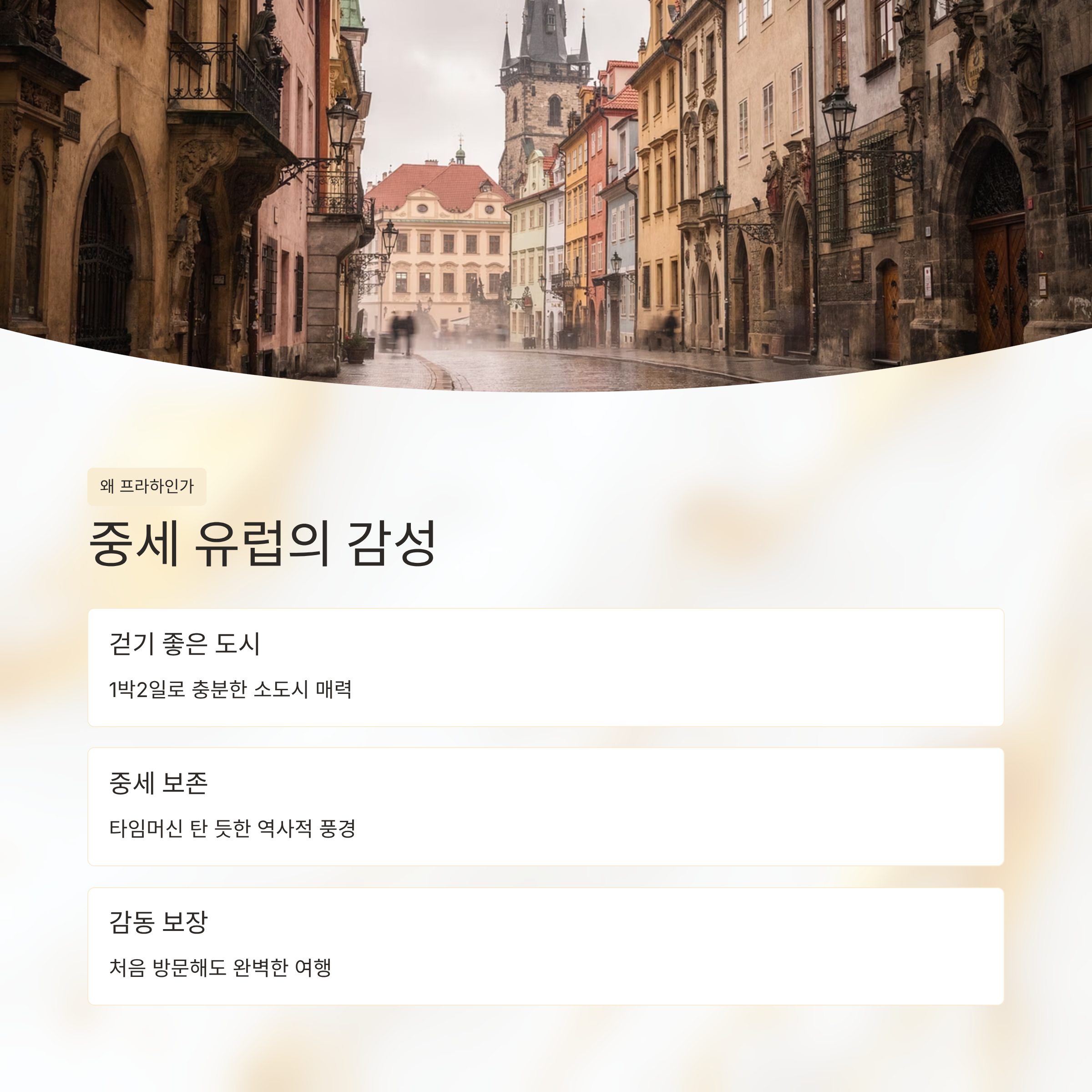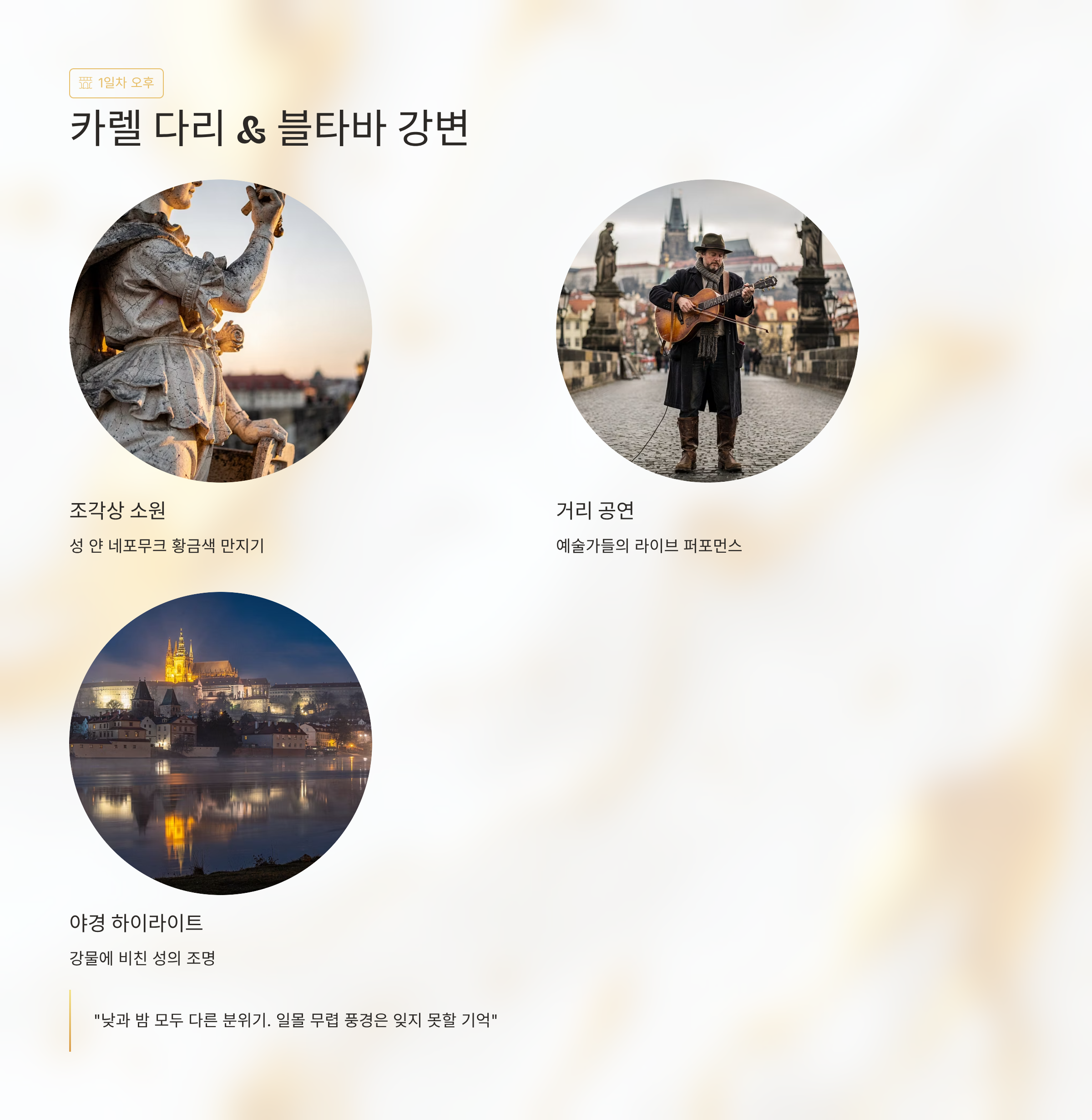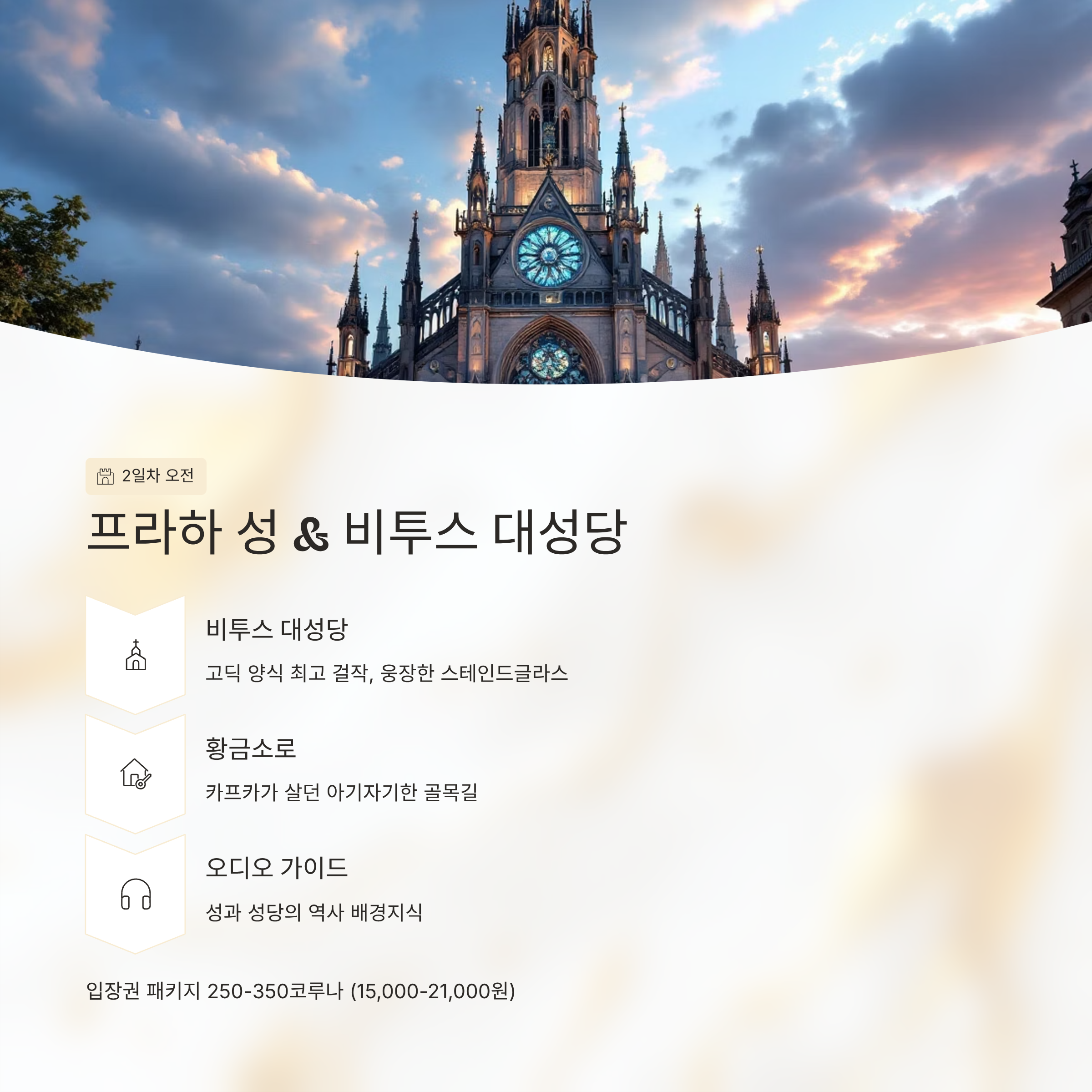 “프라하 성 위에서 내려다보는 도시 풍경은 진짜 감동이었어요. 역사 설명도 재미있고, 골목마다 감성이 살아 있었어요.”주변 관광지 상세설명