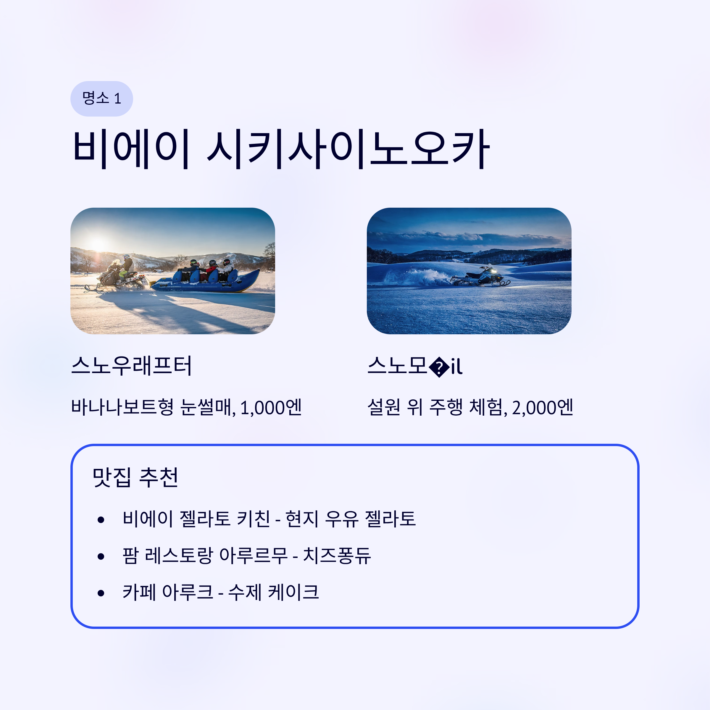 비에이의 드넓은 언덕과 설경이 한눈에 펼쳐지는 SNS 대표 설경 명소. 겨울엔 눈 위를 달리는 스노우래프터와 스노모빌 체험이 인기즐길거리