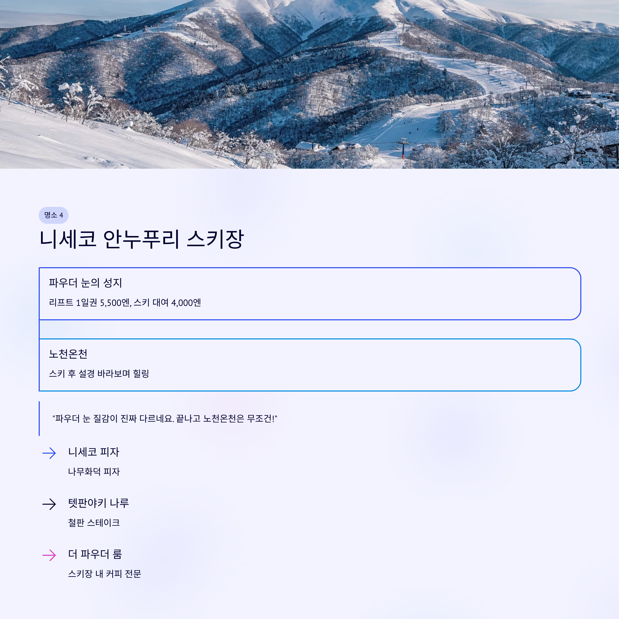 "파우더 눈 질감이 진짜 다르네요. 슬로프가 넓고 시설도 잘되어 있어서 하루 종일 놀 수 있어요. 끝나고 노천온천은 무조건!"인근 맛집&카페