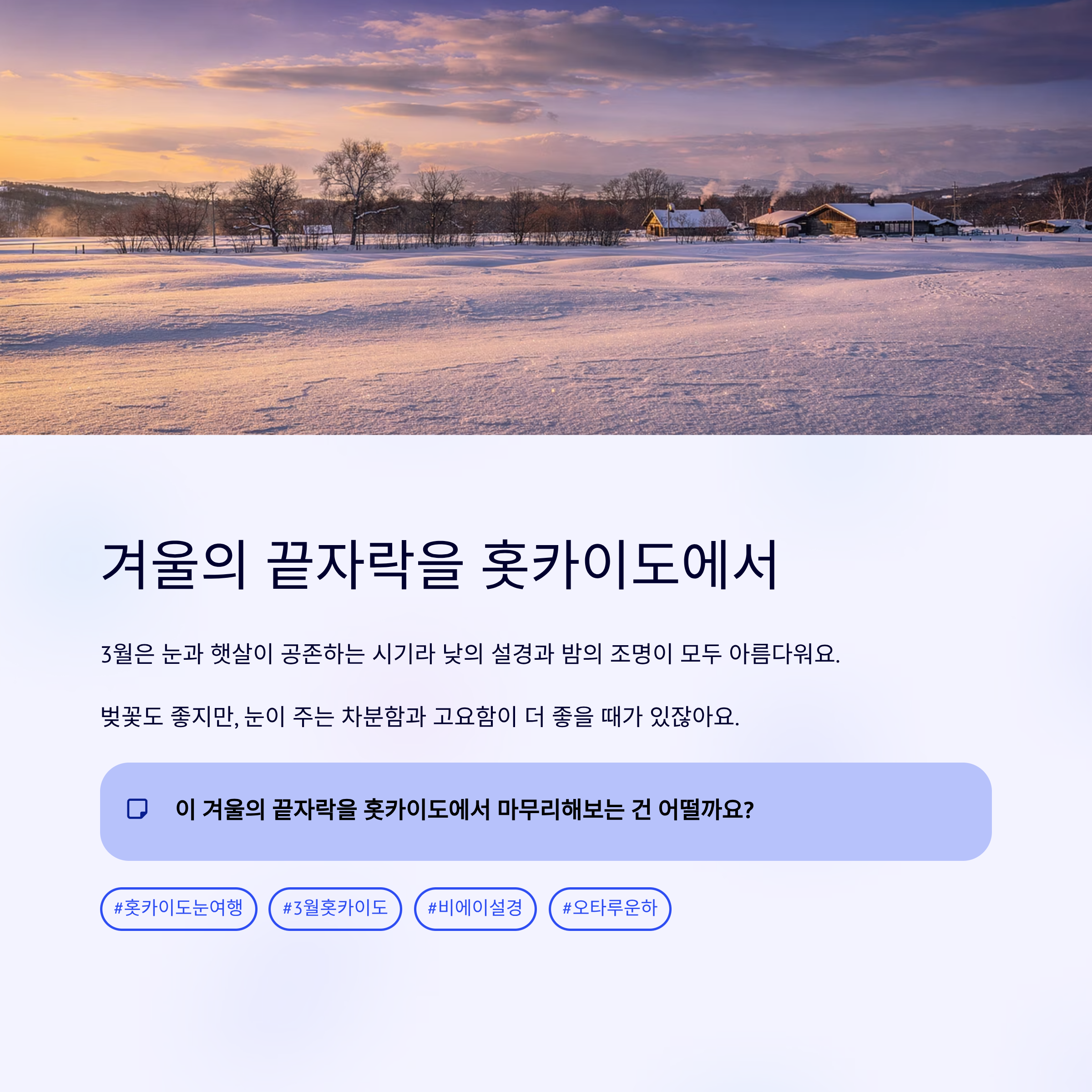 봄의 문턱에서 아직 겨울을 품고 있는 홋카이도는 여행자들에게 더 특별한 경험을 선사합니다. 특히 3월은 눈과 햇살이 공존하는 시기라 낮의 설경과 밤의 조명이 모두 아름다워요. 벚꽃도 좋지만, 눈이 주는 차분함과 고요함이 더 좋을 때가 있잖아요. 이 겨울의 끝자락을 홋카이도에서 마무리해보는 건 어떨까요?