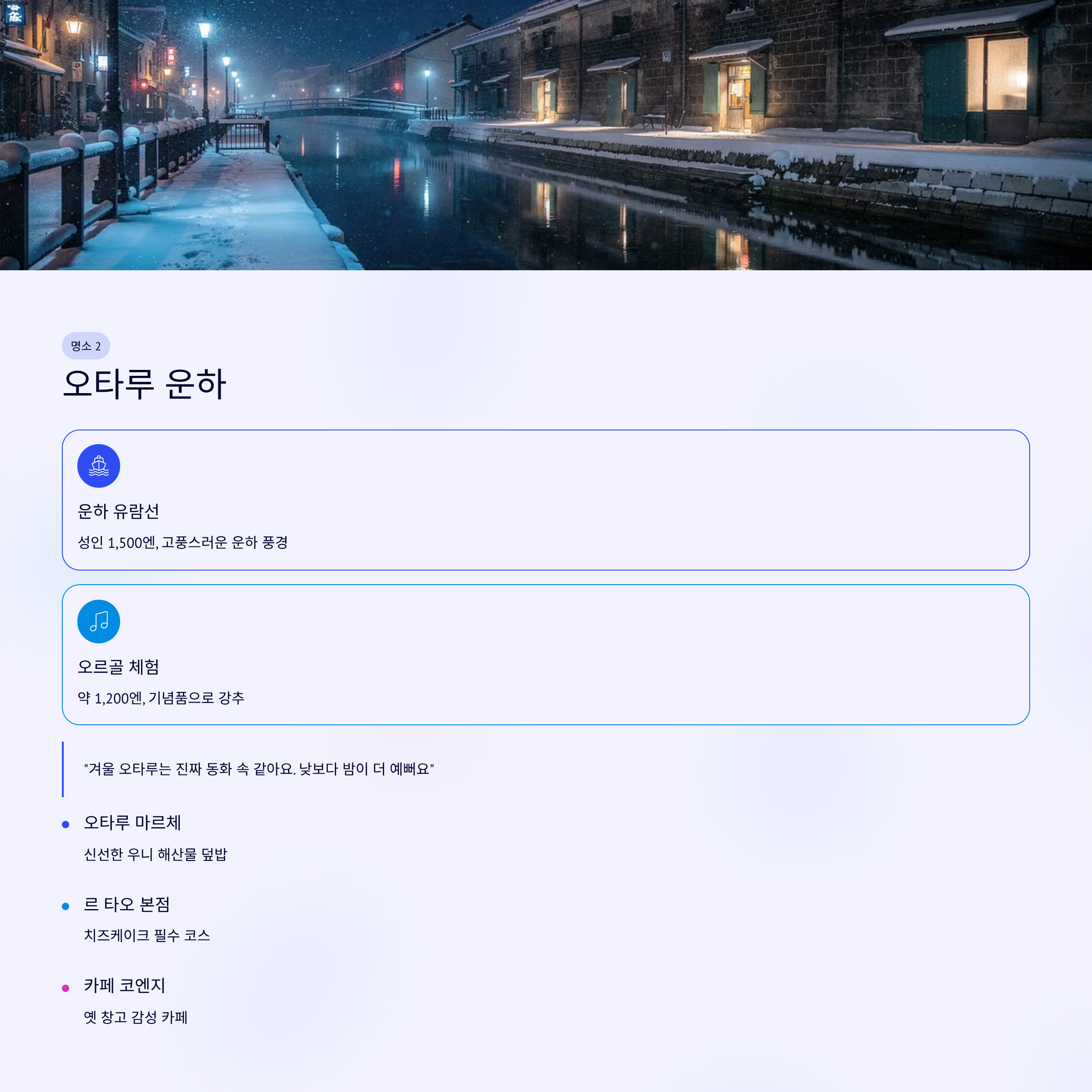 "겨울 오타루는 진짜 동화 속 같아요. 낮보다 밤이 더 예뻐요. 특히 유리 공방에서 만든 오르골이 너무 예뻐서 기념품으로 강추!"인근 맛집&카페