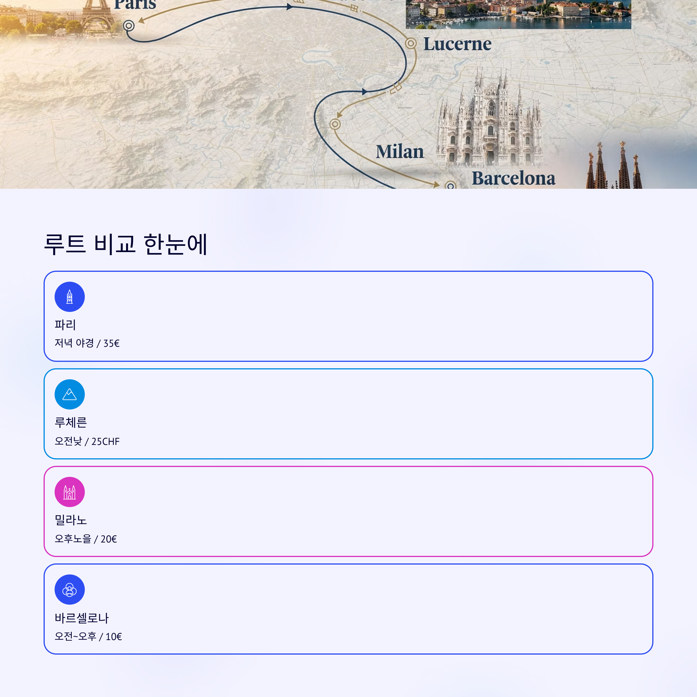 파리 에펠탑 센강 유람선, 트로카데로, 팔레 드 도쿄 저녁 야경 약 35유로 루체른 카펠교 루체른 호수, 피라투스산, 교통박물관 오전~낮 약 25CHF 밀라노 두오모 갤러리아, 스칼라 극장, 브레라 미술관 오후~노을 약 20유로 바르셀로나 구엘공원 사그라다 파밀리아, 까사 바트요 오전~오후 약 10유로