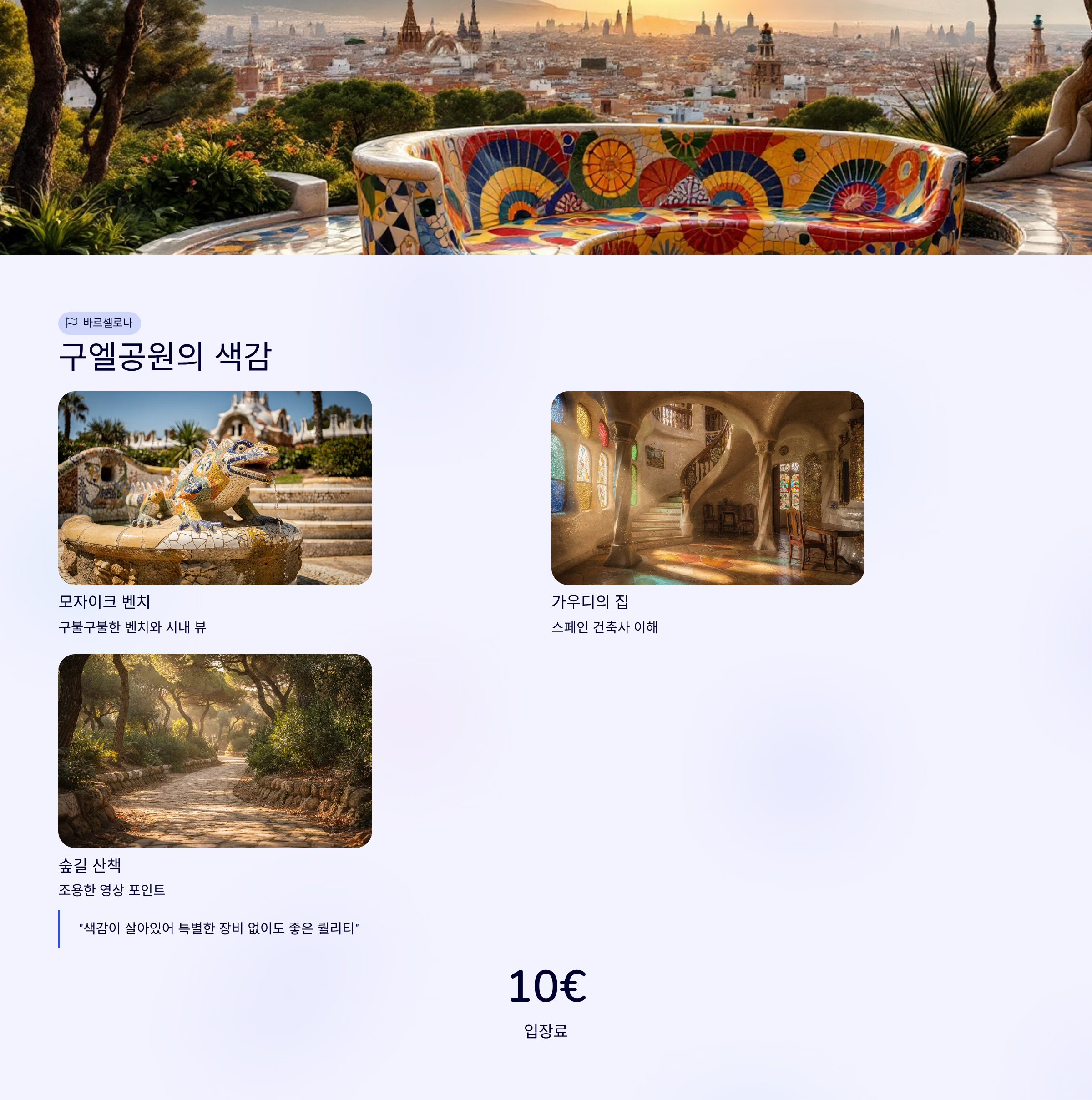 가우디의 감각이 살아있는 환상적인 공원. 색감과 곡선미로 유튜버 영상 배경에 자주 등장즐길거리